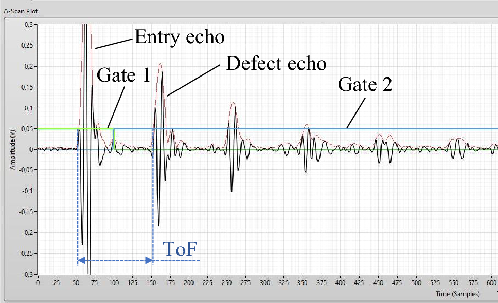 In this paragraph, the settings for signal processing of the ultrasonic device are explained, compare with Fig. 7 and Table 1. The recording delay specifies the number of samples to be skipped after the excitation - useful for sensors with a delay line. The recording length must be set in a way that the backwall echo is displayed. All received signals are represented by a Hilbert transformation. The sample rate defines the number of samples in one second. Gate 1 and gate 2 are used to determine the number of samples between the front wall echo (or rather the entry echo) and the first echo. The first echo can be the back wall echo or the defect echo. By setting the offset from delay, length and level of each gate, the sample associated with the intersection point of the considering amplitude and gate can be determined. With knowledge about the sample rate, the number of samples between the two gates can be converted into the time of flight (ToF). Figure 7 shows the entry echo and the first echo of a defect.