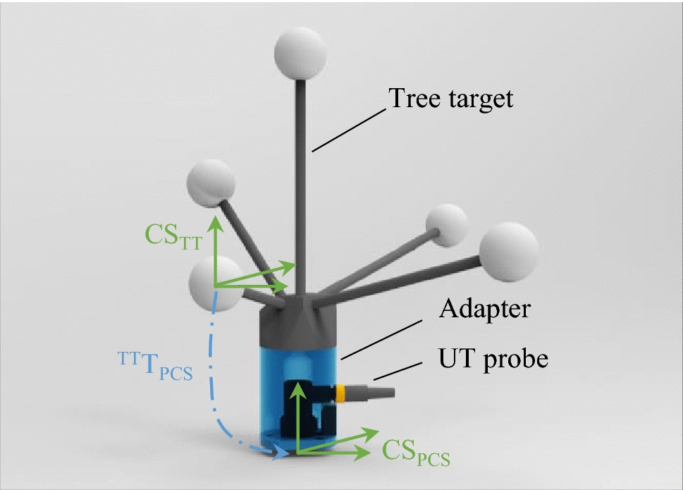 The presented hybrid inspection system can be described as a serial-chain manipulator as shown in Fig. 5. The inspected component (IC) represents the base and the PCS the end-effector. For every joint, a CS is defined. The links between the tracking cameras MLT\(\rightarrow \)MBT and between the UT probe and the tree target (TT) TT\(\rightarrow \)PCS are realised by a 3D-printed adapter, so that they can be regarded as rigid. The links MLT\(\rightarrow \)IC and MBT\(\rightarrow \)TT are based on optical tracking, because their geometric parameters must be determined dynamically by using the corresponding tracking systems.