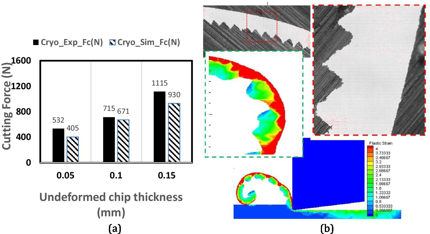 Literature review of the state-of-the-art revealed that there is a very limited finite element based numerical works available for the cryogenic machining of Inconel 718. De Bartolomeis et al. [18] in their review paper pointed out lack of predictive models available when it comes to the machining of Inconel 718. Deshpande et al. [19] also identified the research gap that there is a need to have more reliable predictive models. In this study, dry and cryogenic machining environments are numerically modelled in the AdvantEdge, specialized machining software, with experimental validations. The simulated data is used to provide a deeper analysis of (i) primary shear deformation zone by calculating the chip compression ratio, shear angle, and contact length; (ii) specific cutting energy (SCE); and (iii) chip morphology such as segmentation, valleys, and peaks for plastic deformation.