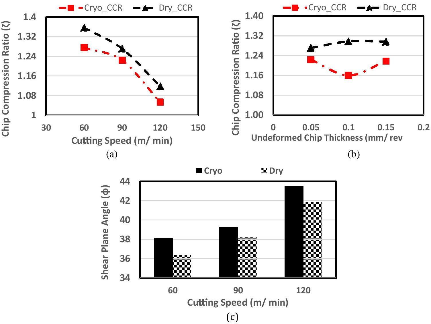 A generic trend was observed for both dry and cryogenic cutting that when cutting speed increases the chip compression ratio decreases. It is linked with the generation of thicker chips at low cutting speed. The generation of thick chips at low cutting speeds can be verified by the low value of shear plane angles.