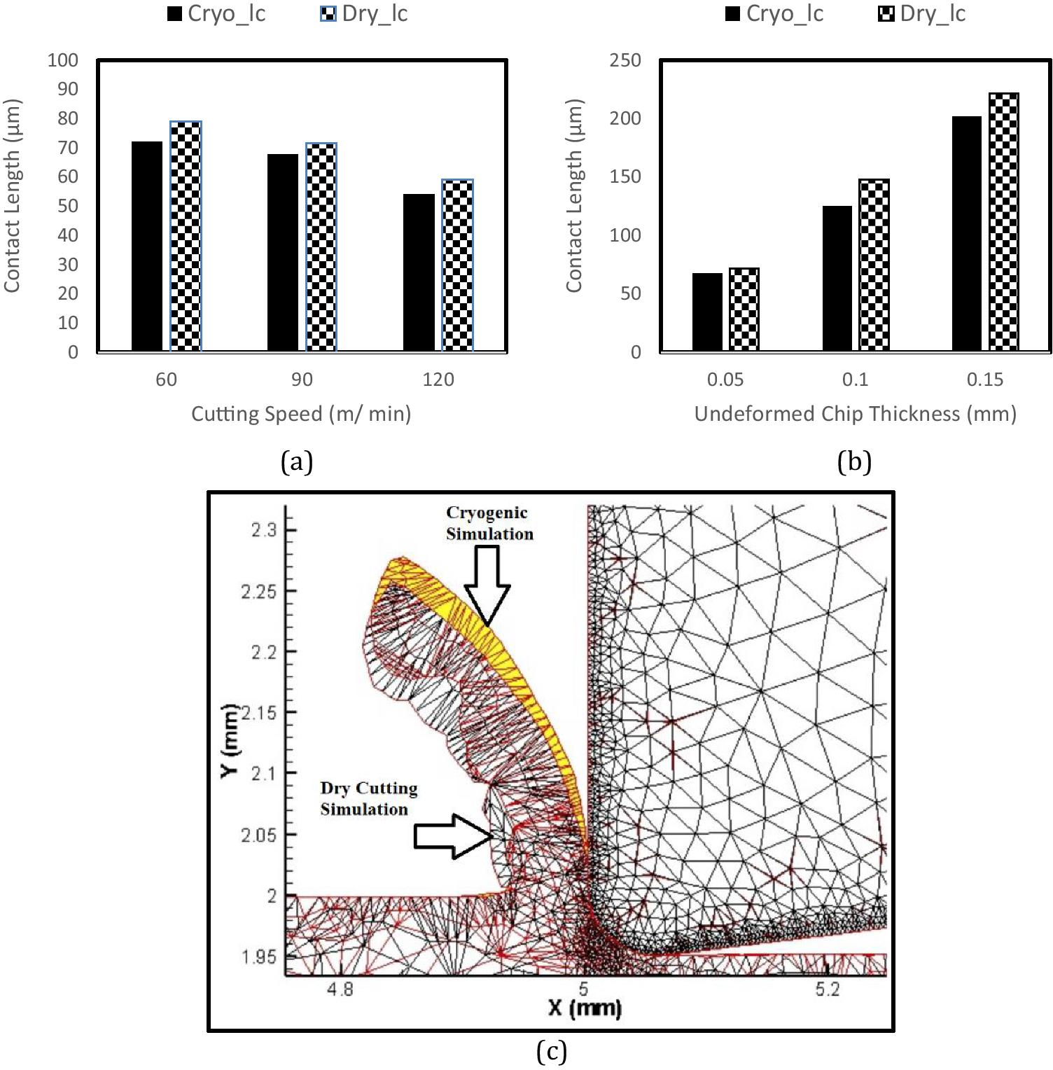 The contact length was higher in the dry cutting as compared to the cryogenic cutting. It was also observed that average chip thickness of dry cutting is larger than the one obtained in cryogenic cutting. The reason can be linked with the lower value of shear angles and resulting higher coefficient of friction in the dry cutting.