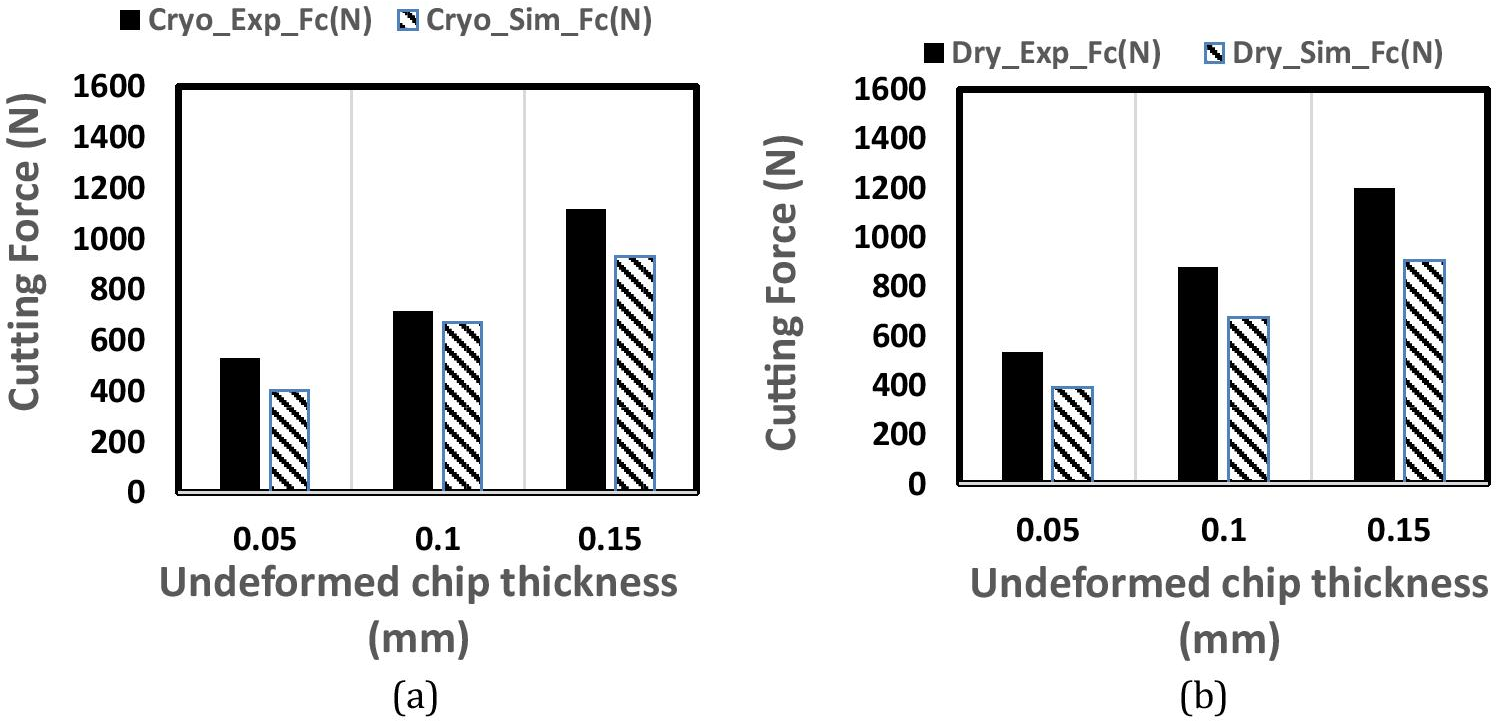 The variations in forces are because the workpiece material is modelled as perfect plastic material and ignores any pre-stressed conditions available in the component in the form of residual stresses. Both experimental and simulated forces were found slightly lower in cryogenic cutting. Lower forces in the cryogenic cutting represent efficient cooling action that resulted in reducing the coefficient of friction at the tool chip interface.