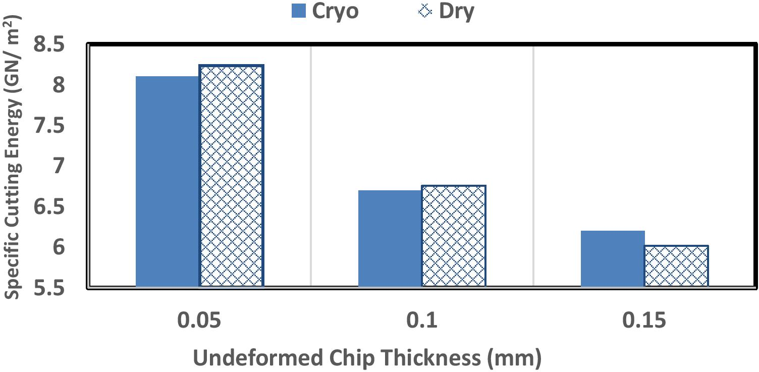 Higher specific cutting energy (SCE) was observed for lower value of undeformed chip thickness under both dry and cryogenic cutting environments. It is due to the presence of plowing force at low value of undeformed chip thickness. This phenomenon is referred as size effect.