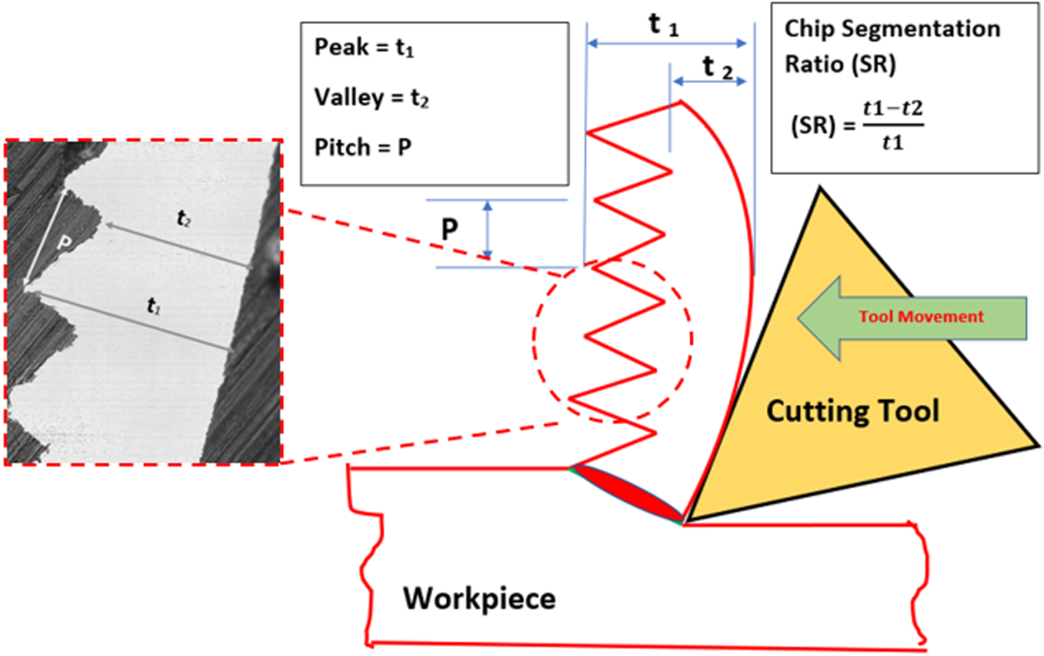In both dry and cryogenic cutting, chip morphology parameters such as peaks, valleys, and pitches increase by increasing the undeformed chip thickness. Higher value of peaks with increasing undeformed chip thickness represents that there is more shear deformation present. Segmented chip is formed due to development of shear band due to the simultaneous presence of thermal softening and strain hardening in workpiece material.