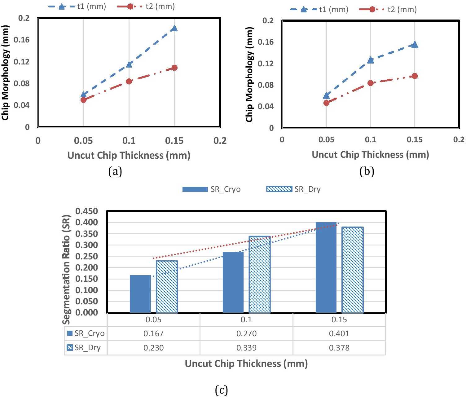 Reduction in chip segmentation ratio was observed at low levels of undeformed chip thickness for cryogenic machining when compared to the dry cutting. It can be attributed due to improved cooling and lubrication in the cryogenic machining.