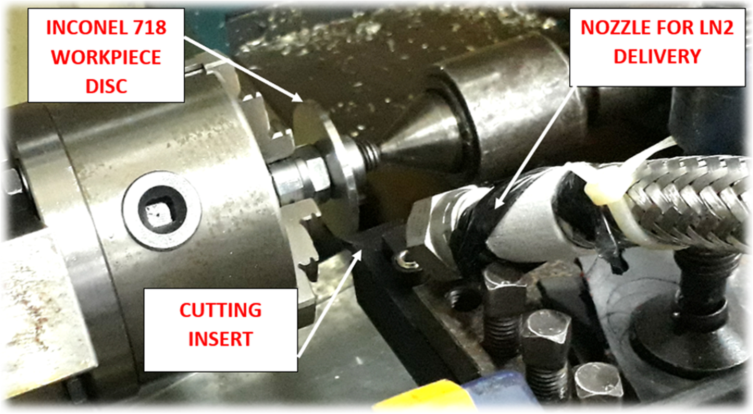 It is evidenced from several sources found in the metal cutting literature that application of cryogenic cooling at the tool–chip cutting interface results in the improvement of hardness and strength of the cutting tool material, reduces the toughness of the materials making it more brittle, and reduces the chemical reactivity/built-up-edge formation at the cutting interface and lowering the coefficient of friction. Hong and Zhao [1] investigated the performance of cryogenic cooling during the cutting process; they figured out that workpiece’s ductility and toughness are reduced due to the exposure of cryogenic fluid. Reduction in ductility and toughness improves machinability. The study also pointed out at the efficient cooling at the cutting interface that reduces the possibility of built-up-edge (BUE) formation. Reduction in ductility of the workpiece material improves that chip breakability and chip up curling can be facilitated to lower the tool chip contact length. Cryogenic fluid’s temperature also helps to maintain the strength of cutting tool material resulting in lower tool wear. However, the performance of cryogenic cooling is highly linked with the tool–workpiece material pair [2]. Nouzil et al. [3] numerically investigated the influence of jet radius, jet location, and cutting speed when machining Inconel 718. The work has studied shear angle and chip compression ratio to understand the influence of metal cutting process physics. The study revealed that change in jet location influences on the shear angle and it can increase the shear angle that can decrease the shear area and hence reduce the cutting forces and cutting power. De Bartolomeis et al. [4] provided a complete section about the cryogenic machining of Inconel 718 in the review article. The study also provided a brief comparison with conventional flood cooling as a reference. The study concluded that cryogenic cooling provides a superior surface roughness, surface integrity, environment friendliness, and evaporation of dangerous particles etc. over conventional flood cooling method.