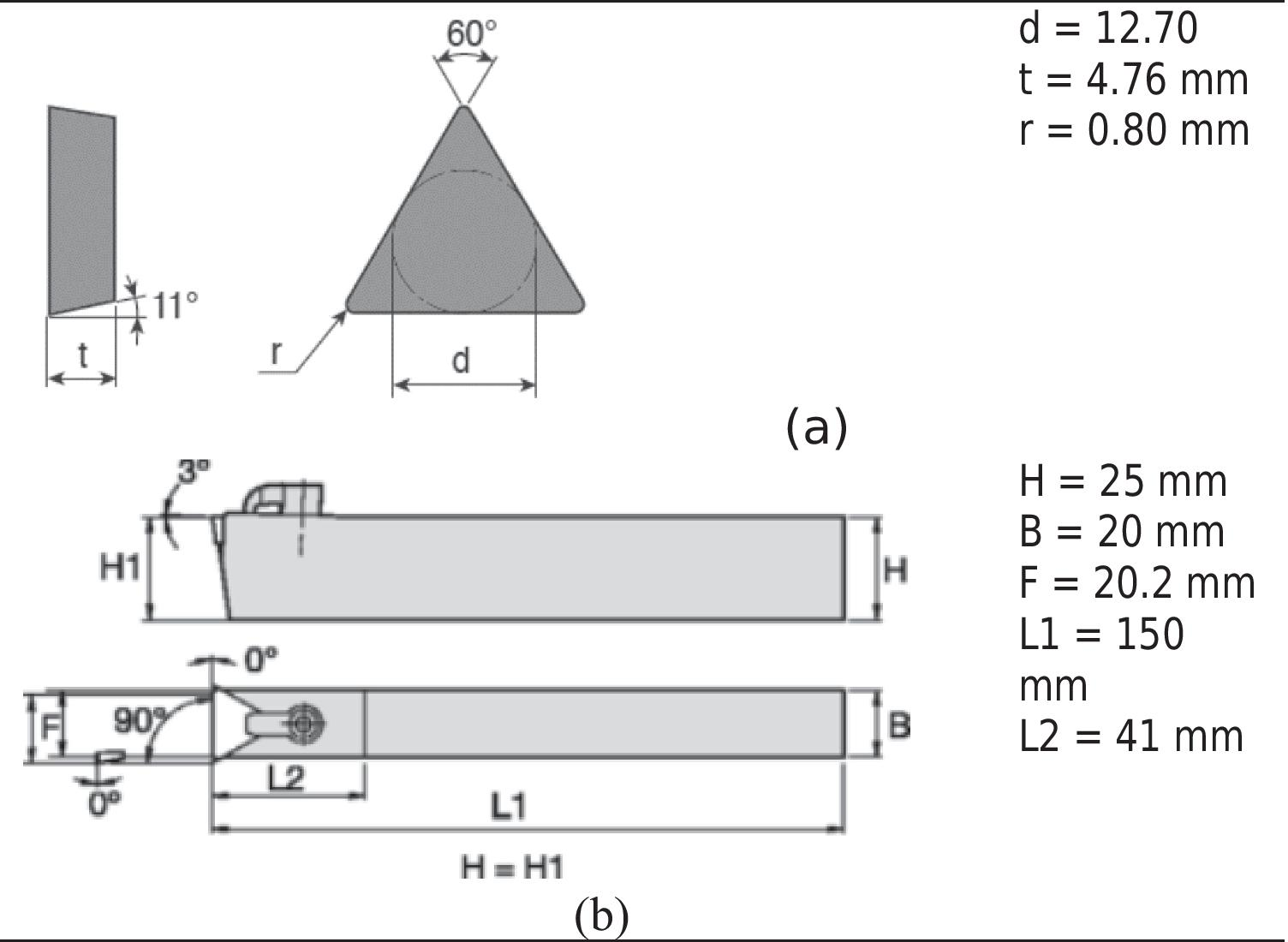 To perform the orthogonal machining experiments, PVD TiAlN coated triangular shaped cutting inserts (TPGN 220,408, Grade: KCU 10, manufactured by Kennametal) were employed. KCU 10 grade is composed of advanced multilayer PVD coating over a very deformation-resistant unalloyed carbide substrate. The cutting inserts were mounted on CTCPN2520M22 tool holder.