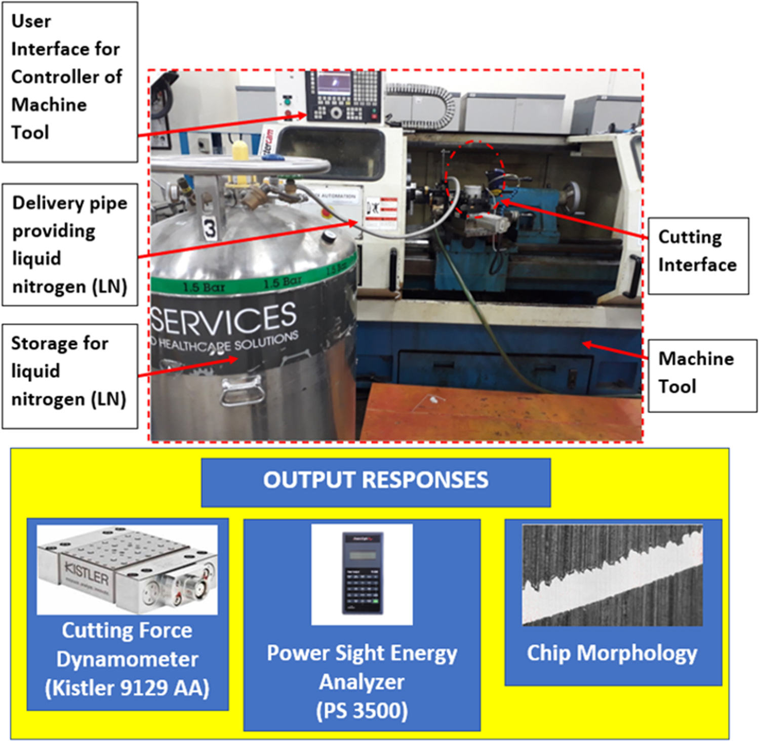 Keeping in view that continuous cutting mode is more aggressive in machining, turning experiments were conducted under cryogenic machining environment. To have proper comparison, dry and flood cutting experiments were also performed. Machinability was experimentally investigated using the output responses in the form of cutting forces, power, and chip morphology. Liquid nitrogen was delivered from the direction of the tool rake face with the flow rate of approximately 0.5 kg/min mass under 1.5 bar pressure. The outer nozzle diameter was 3 mm, and it was directed in the cutting zone at an ejecting angle of 45 ̊. The ejecting method was only rake face in this work. The constant distance of approximately 12 mm was kept between the nozzle and the cutting tool. A KISTLER™ 9129AA three-channel dynamometer was used along with a multichannel charge amplifier type 5080 to measure the machining forces. Appendix Table 6 has specification of the dynamometer. KISTLER™ Dynoware software package was used to process the output signal from charge amplifier. The measurement was made with an acquisition rate of 10,000 Hz. The chip morphology was investigated and observed by using optical microscope.