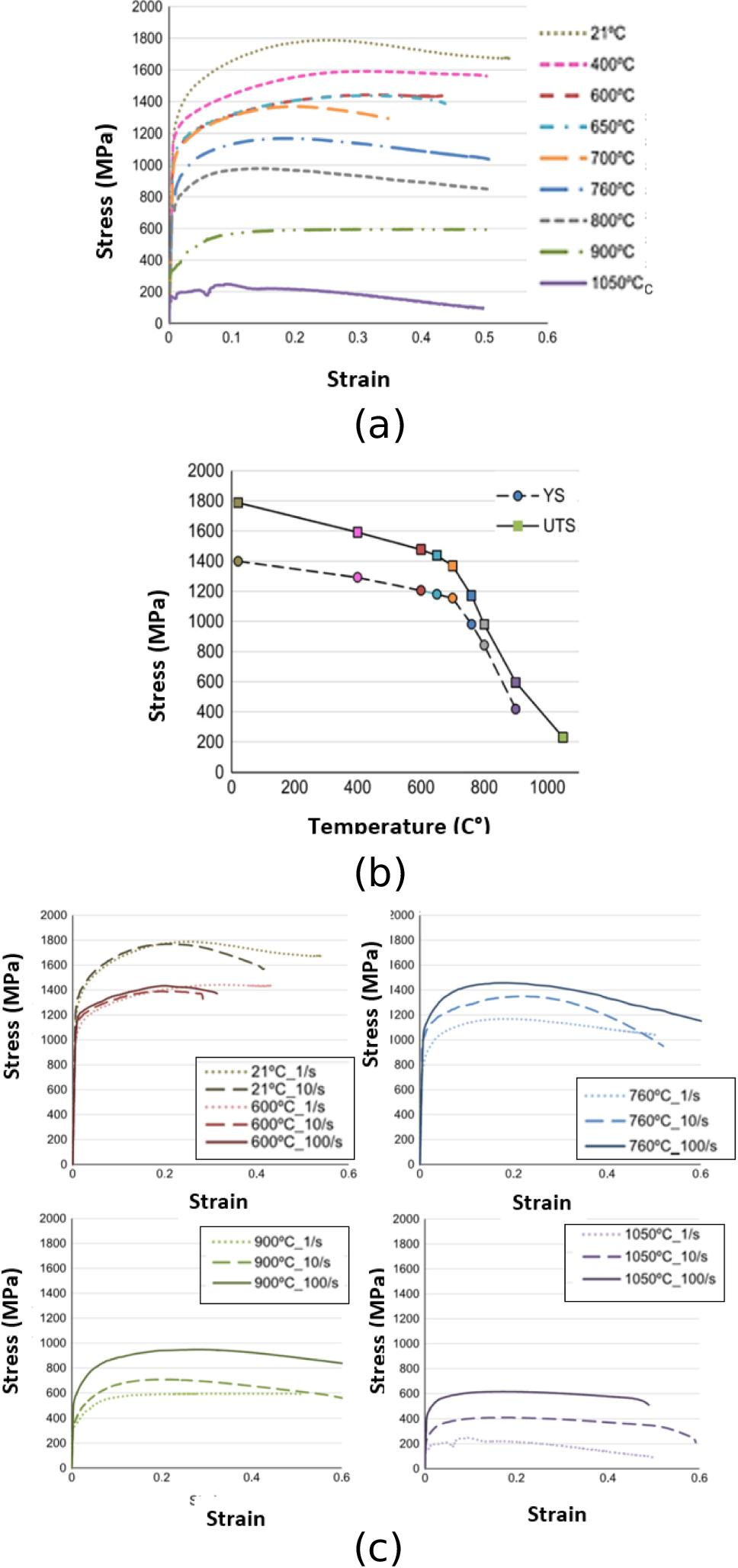 Flow stress behavior of Inconel 718. a Testing at various temperatures at strain rate of 1 s−1. b Thermal softening behavior. c Temperature influence with respect to the various strain rates (obtained from [23] with kind permission from Elsevier)