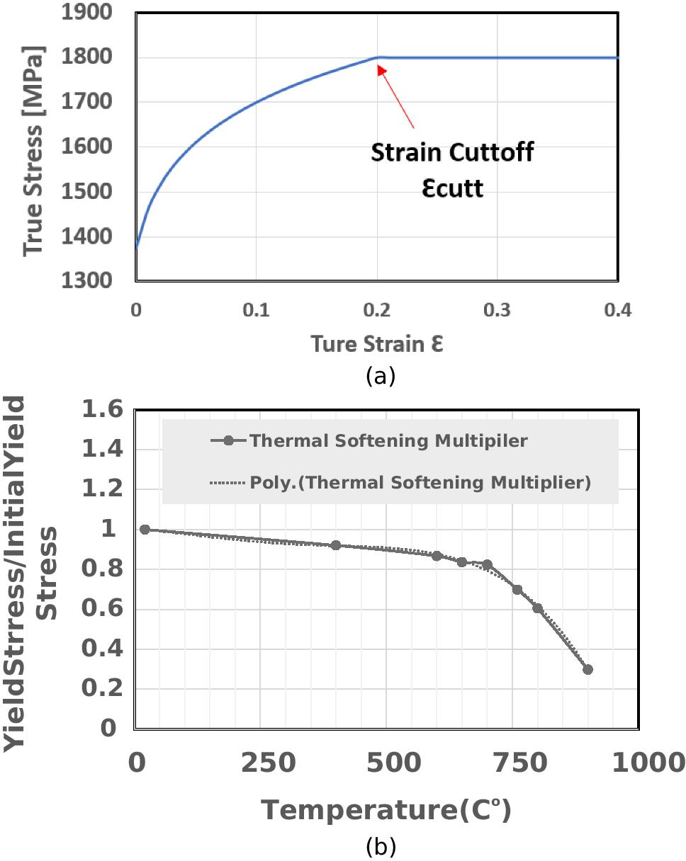 In Eqs. 11 and 12, thermal softening function is represented. Thermal softening function is composed of 5th-order polynomial with C1–C5 constants. These constants C1–C5 are curve fitted by the compression test data at elevated temperatures. Where T is the temperature during the test, Tm is the melting temperature and Tcut is the cut-off temperature. Figure 6a and b show the strain hardening and thermal softening behaviors obtained using the experimental data in Fig. 5.