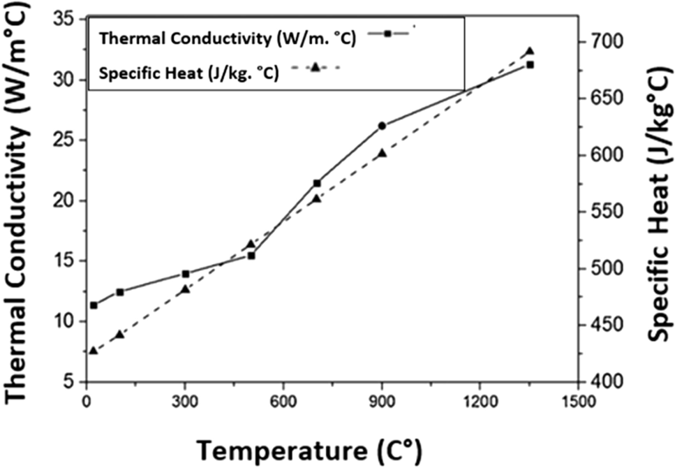 Damage in the workpiece material is also very important to produce chip shape. Advantage can simulate damage in the workpiece material by using a damage function D. The damage function D is shown in Eq. 15. The fracture strain can be represented using temperature-dependent model as shown in Eq. 16 [21]. In the current study, parameters were curve fitted to polynomial function using the Johnson Cook (JC) damage model [28, 29]. Table 3 shows the constants used in the current study. The variation of thermal conductivity and specific heat capacity with temperature for Inconel 718 is obtained from [30] as shown in Fig. 7. Damage starts in an element when the value of the “dimensionless damage function” of that element reaches 1, where \({\Delta \varepsilon }_{i}^{p}\) is the instantaneous increment of strain in the element, and \({\varepsilon }_{{f}_{i}}^{p}\) is the instantaneous fracture strain in that increment. D0–D5 parameters can be calculated using the experiments of hot and room temperature tensile test and drawing the fracture strain against temperature.