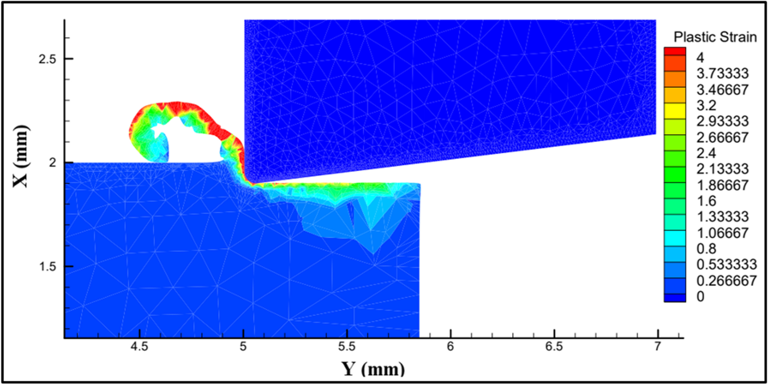 There are different possibilities in the software package to model the constitutive behavior of the workpiece material. The workpiece material (Inconel 718) in this study was modelled using advanced representation of power law. This advanced power law has capability to incorporate damage law along with temperature-dependent thermal conductivity and heat capacity [21]. Workpiece was meshed with minimum element size of 0.02 and maximum size of 0.1 for a total number of 24,000 nodes. A high density of mesh was defined at the cutting edge and adaptive remeshing enabled to avoid elemental distortions beyond certain tolerance. When elemental distortions exceed the decided tolerance, adaptive remeshing is triggered automatically. The meshing is continuously monitored, and elemental distortion is fixed by continuous refinement and improvement [22]. The mesh refinement factor and coarsening factors were set as 2 and 6 respectively.