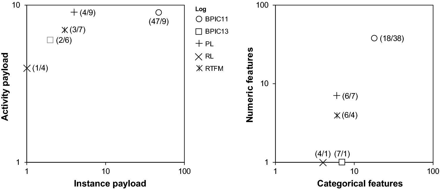 Data perspective of log classification: activity-to-instance ratio (left, a) and numeric-to-categorical ratio (right, b) of payload data (logarithmic scales)