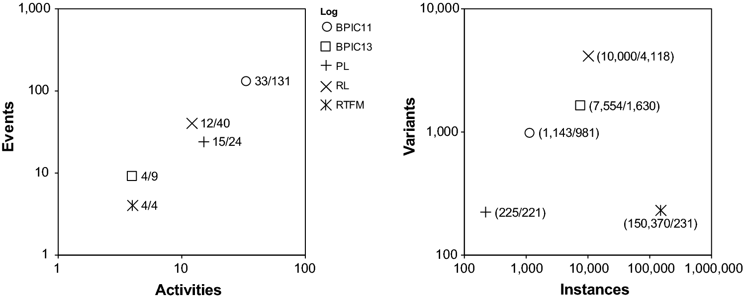 Figure 2 classifies the used event logs from a control flow perspective. Figure 2a illustrates events-to-activities ratio. The more a log is situated above the bisector, the more the related process includes iterations and loops. For example, administration processes such as RTFM and BPIC13 perform a few standardized activities several times, whereas BPIC11 and PL include more but highly specific activities with few repetitions. The classification shows that a low average number of events per instance implies a low average number of activity types. Finally, Fig. 2b illustrates the variants-to-instances ratio. Logs containing few unique variants typically originate from highly standardized processes, e.g., the administration of road traffic fines (i.e., RTFM). In contrast, the treatment of patients in a hospital (i.e., BPIC11) tends to require individualized routing where almost every instance leads to a specific variant.