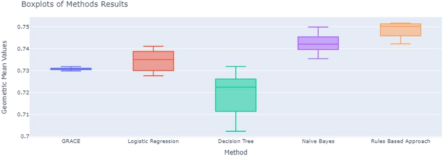 Figure 10 presents the boxplots of the geometric mean results across the different methods over 10 runs. It is clear that GRACE method has the lowest variability in the results while the decision tree presents the highest. The results between the GRACE and logistic regression seem similar which reinforces the result of the statistical test presented above for these two methods. The decision tree model is the method with the worst results, and the Naïve Bayes as well as the rule-based approach are the methods with the best results. The rule-based approach presents the highest median value for Gmean.