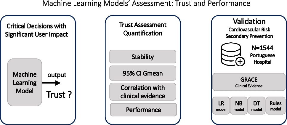 The common black box nature of machine learning models is an obstacle to their application in health care context. Their widespread application is limited by a significant “lack of trust.” So, the main goal of this work is the development of an evaluation approach that can assess, simultaneously, trust and performance. Trust assessment is based on (i) model robustness (stability assessment), (ii) confidence (95% CI of geometric mean), and (iii) interpretability (comparison of respective features ranking with clinical evidence). Performance is assessed through geometric mean. For validation, in patients’ stratification in cardiovascular risk assessment, a Portuguese dataset (N=1544) was applied. Five different models were compared: (i) GRACE score, the most common risk assessment tool in Portugal for patients with acute coronary syndrome; (ii) logistic regression; (iii) Naïve Bayes; (iv) decision trees; and (v) rule-based approach, previously developed by this team. The obtained results confirm that the simultaneous assessment of trust and performance can be successfully implemented. The rule-based approach seems to have potential for clinical application. It provides a high level of trust in the respective operation while outperformed the GRACE model’s performance, enhancing the required physicians’ acceptance. This may increase the possibility to effectively aid the clinical decision.