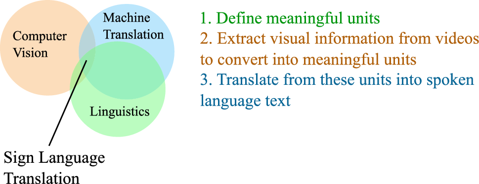 Several previously published scientific papers liken SLR to gesture recognition (among others, [12, 13]), or even present a fingerspelling recognition system as an SLT solution (among others, [14, 15]). Such classifications are overly simplified and incorrect. They may lead to a misunderstanding of the technical challenges that must be solved. As Fig. 1 illustrates, SLT lies on the intersection of computer vision, machine translation, and linguistics. Experts from each domain must come together to truly address SLT.