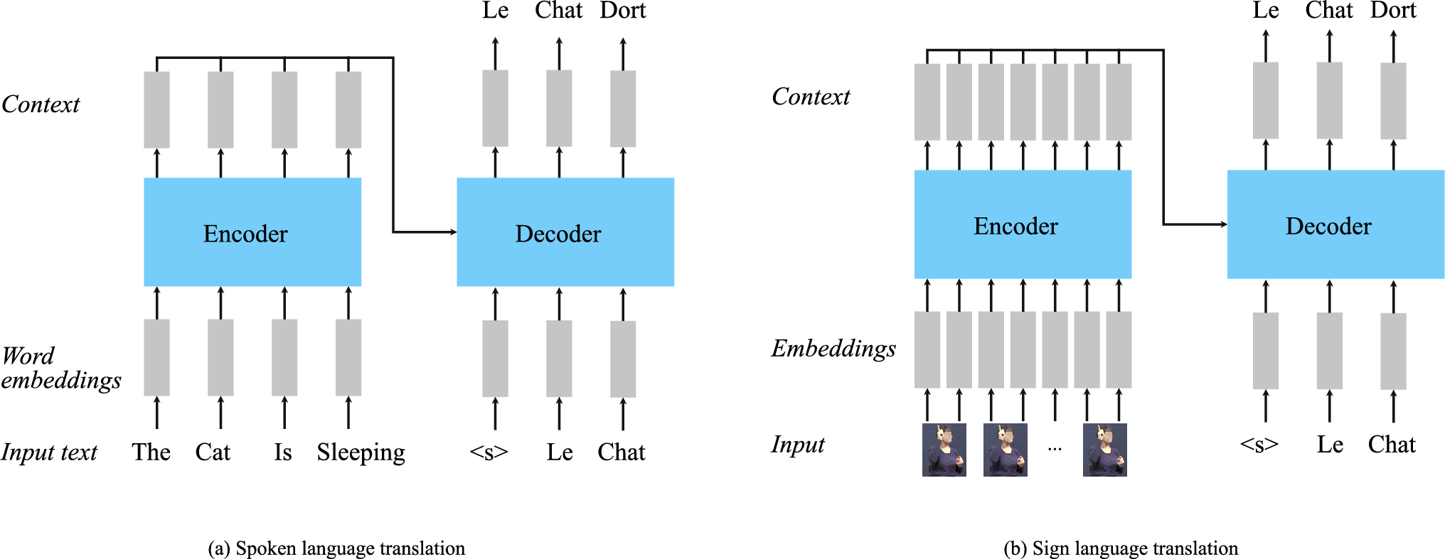 Neural machine translation models for spoken (a) and sign (b) language translation are similar; the main difference is the input modality: text for (a) and video for (b)