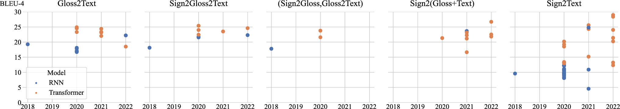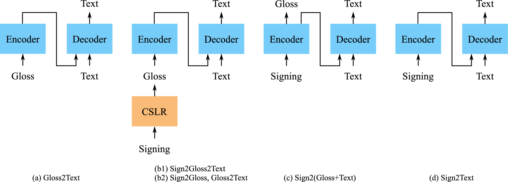 There are five distinct translation tasks in the considered scientific literature on SLT. The Sign2Gloss2Text and (Sign2Gloss, Gloss2Text) models both use the same architecture, but a different training algorithm