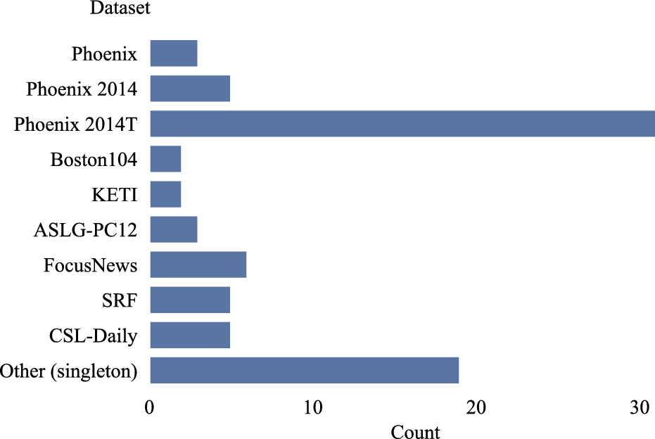 Three scientific databases were queried: Google Scholar, Web of Science and IEEE Xplore.4 Four queries were used to obtain initial results: “sign language translation,” “sign language machine translation,” “gloss translation” and “gloss machine translation.” These key phrases were chosen for the following reasons. We aimed to obtain scientific research papers on the topic of MT from sign to spoken languages; therefore, we search for “sign language machine translation.” Several works perform translation between sign language glosses and spoken language text, hence “gloss machine translation”. As many papers omit the word “machine” in “machine translation,” we also include the key phrases “sign language translation” and “gloss translation.”