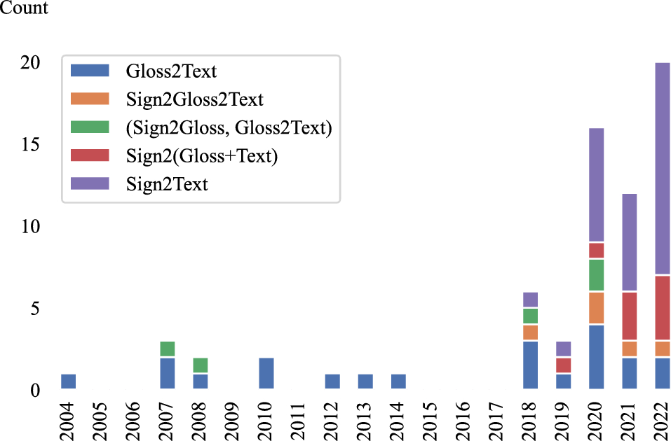 The reviewed papers cover five distinct translation tasks that can be classified based on whether, and how, glosses are used. To denote these tasks, we borrow the naming conventions from Camgöz et al. [6, 37]. These tasks are illustrated in Fig. 3.