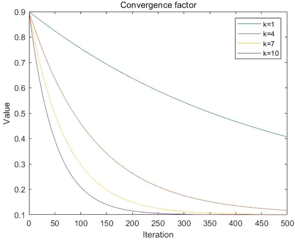 where \({\omega _u}\) and \({\omega _l}\) are the upper and lower bounds of the convergence factor, respectively. k is the impact factor. When k takes different values, the corresponding changes in the convergence factor are shown in Fig. 2. In the early iterations, the convergence factor is larger and scales down more, which will allow the population to perform a broad exploration. In later iterations, the convergence factor decreases and slows, which allows MGEHO to perform a fine local search. As observed in Fig. 2, when the impact factor k changes, \(\omega\) decreases in a nonlinear manner, and the rate of decrease gradually accelerates as the impact factor increases. The choice of the influencing factor depends on the choices and requirements of the specific problem. On this basis, the position of elephant individual j in clan \({C_i}\) is updated in the following way: