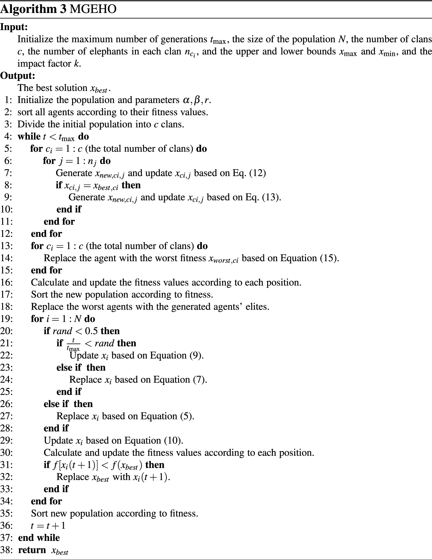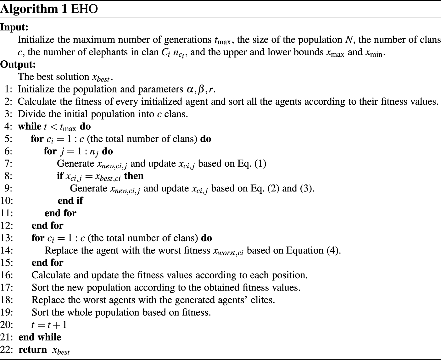 Elephant herding optimization (EHO) is a population-based algorithm proposed by Wang et al. [19] . Inspired by the nomadic herding behaviour of elephant populations, EHO is designed to solve global optimization problems. In EHO, an entire population is divided into different clans. Each clan is led by a female matriarch, while the male elephants live independently when they reach adulthood. EHO sets up two operators, a clan updating operator and a separation operator, to update the positions of the agents. A clan updating operator is implemented for each individual, and the next position of each individual is updated according to the current position in relation to the position of the clan leader. Subsequently, the agent with the worst position is replaced by the separation operator to speed up convergence and enhance the diversity of the population. In terms of advantages, EHO has fewer controlled parameters, is easier to implement, and has better performance than other optimization approaches, so it attracts much attention from mathematicians and engineers [20].