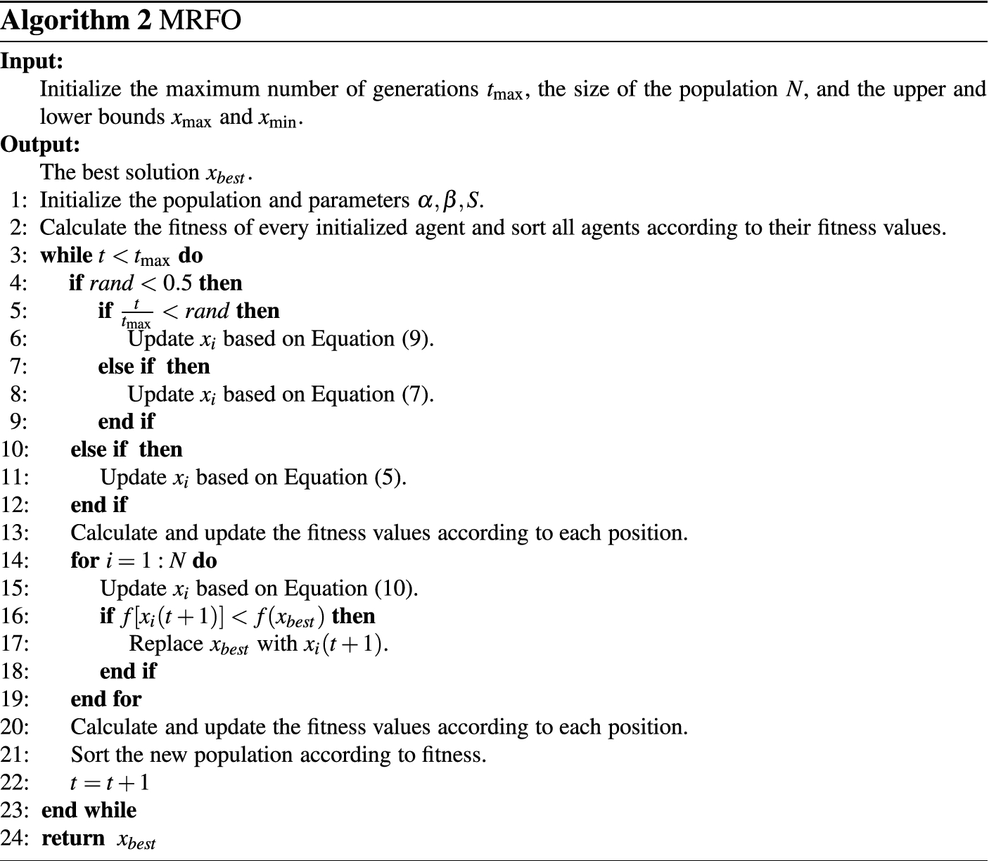 In addition, MRFO is a novel optimization algorithm proposed by Zhao et al. [28]. It is a promising and powerful optimizer inspired by the predatory behaviour of manta rays. MRFO has three foraging operators, namely, chain foraging, cyclone foraging, and tumble foraging operators. Recently, researchers have introduced MRFO to other fields. For example, Ekinci et al. [29] combined the opposition-based (OBL) with MRFO and hybrid simulated annealing algorithm to provides MRFO a better exploration capability. Shaheen et al. [30] optimized the MRFO algorithm by using adaptive penalty parameters and introduced it to handle a thermal scheduling problem. In addition, MRFO has been extended to many fields, such as feature selection (FS) [31], fuel power generation [32], system identification [33], photovoltaic system operation [34], and other areas.