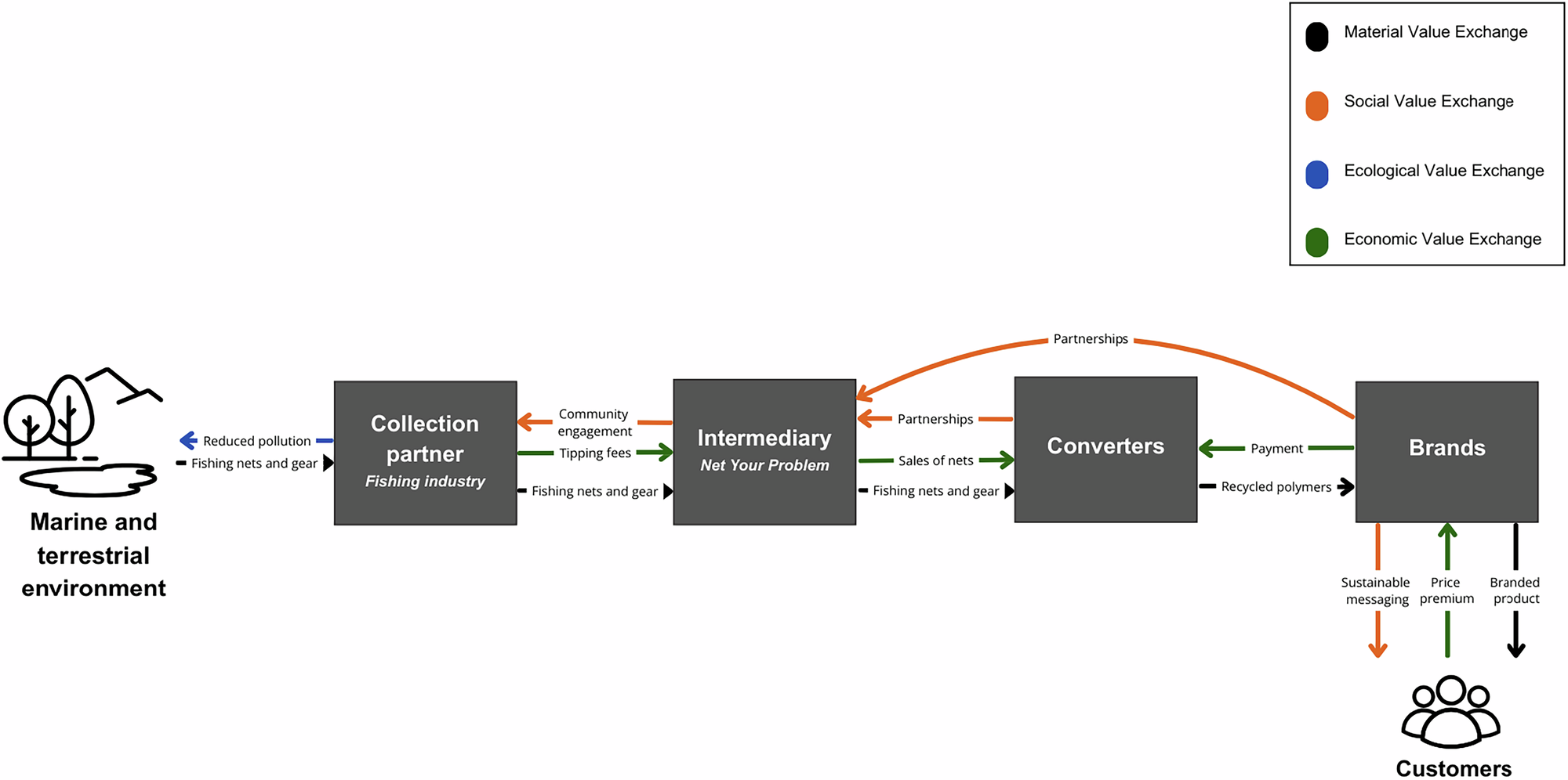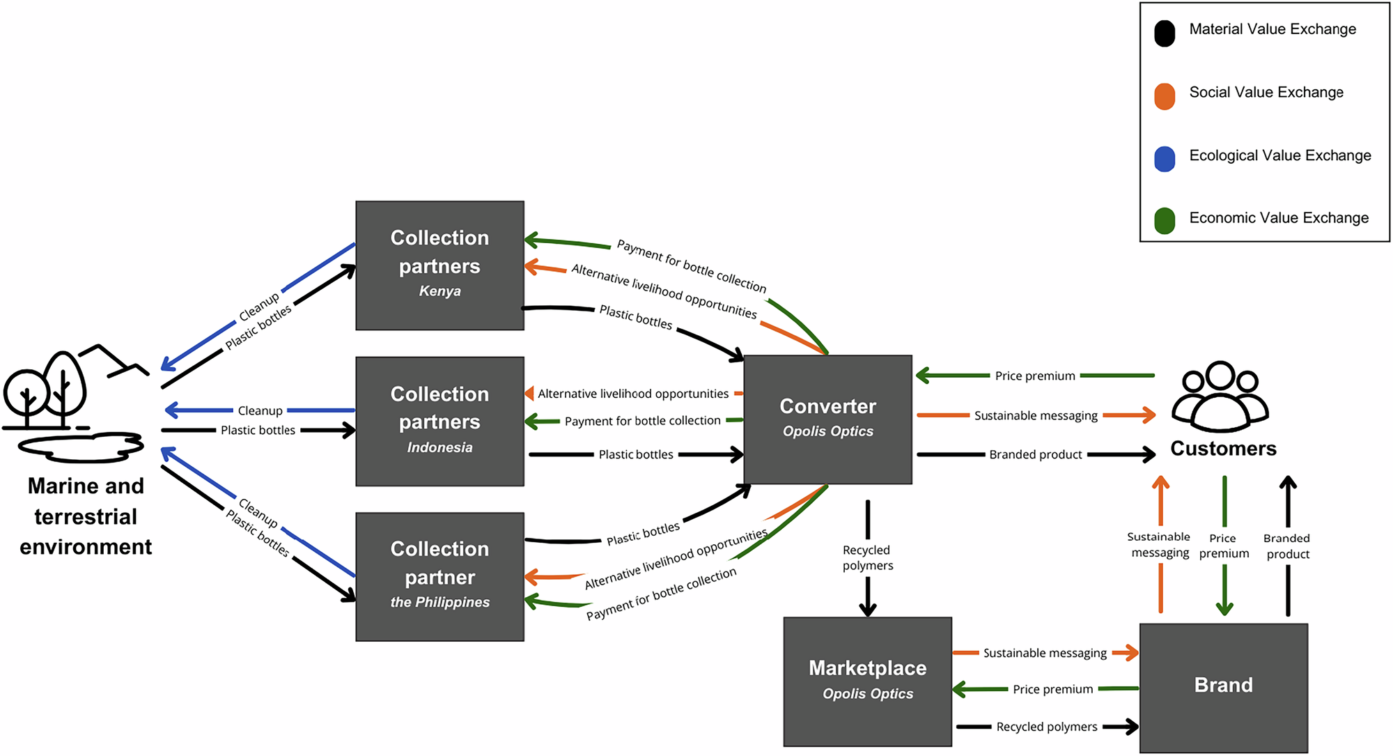 Table 3 briefly summarizes the value exchange mechanisms from each case to demonstrate similarities and differences between the five case studies. Each of the five cases illustrates how new sources of regenerative value are created through the networks that they develop in their entrepreneurial and sourcing activities. While each case is unique, there is a general pattern of for-profit companies generating income through the sale of re-manufactured materials to fund or directly create social and ecological impact through their business operations. The materials created by these companies re-assimilate wastes from various countries and the global commons into material supply chains for products that would otherwise be produced with virgin petroleum polymers.