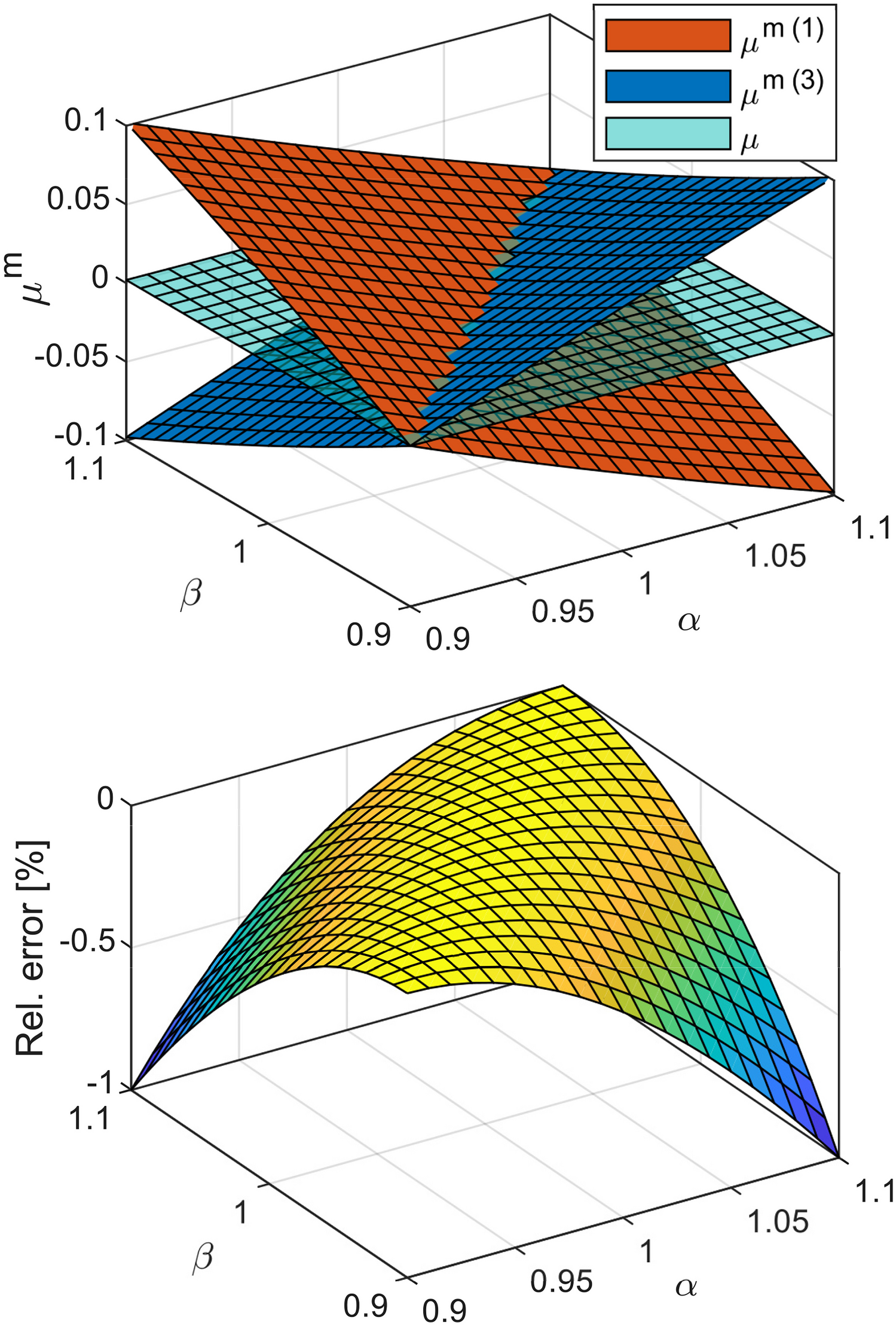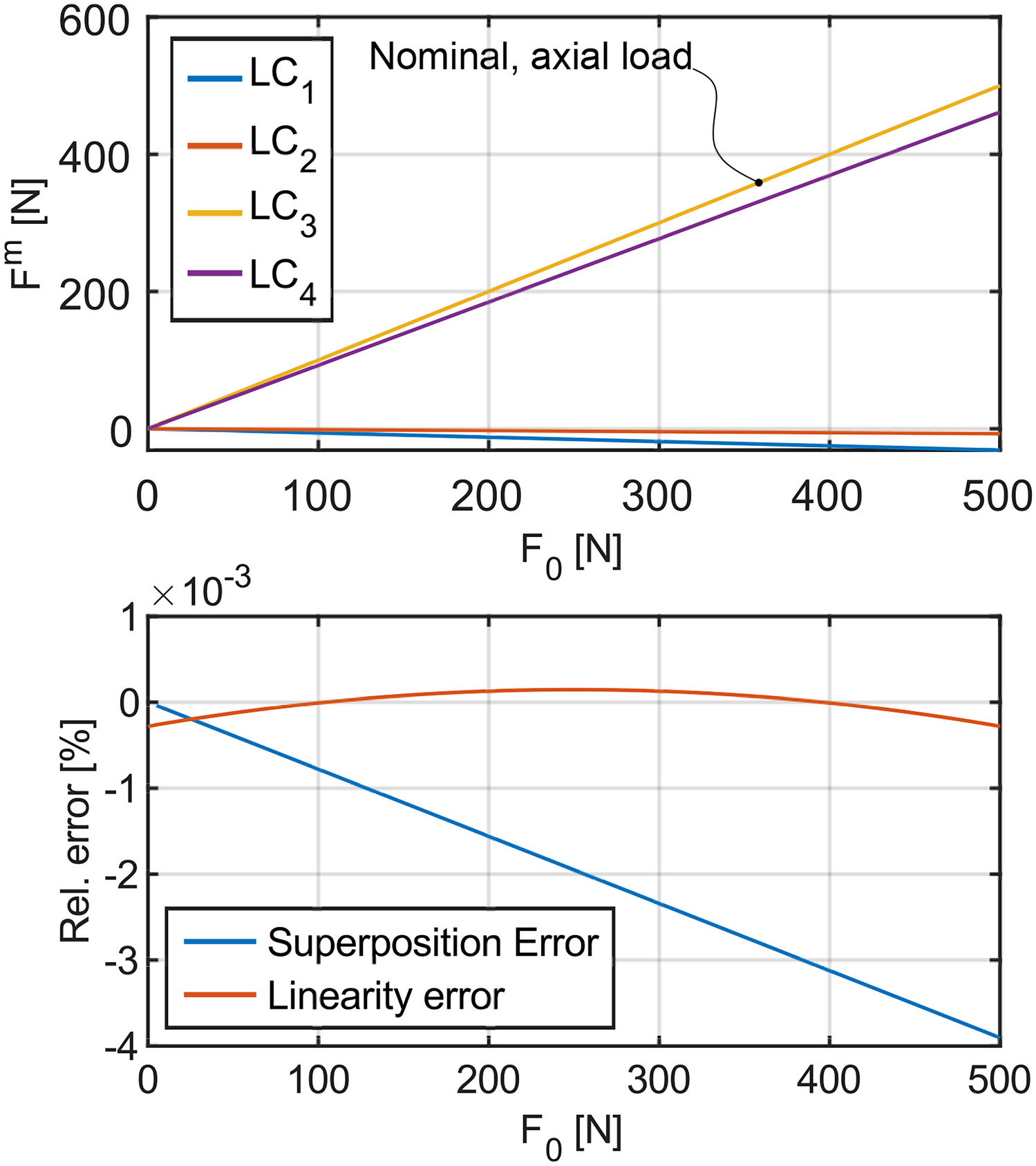 With the S-beam load cells, if the load is purely axial, then \(\varepsilon _3+\varepsilon _4=\varepsilon _1+\varepsilon _2=0\) which yields a linear response. However, if the strains in the denominator don’t balance each other, the response becomes theoretically nonlinear, which happens with the cross loads altering the character of the strain field. Since it is a good assumption that \(GF=2\) and that \(\varepsilon _i<< 1\), one can see that the nonlinearity is weak; this is demonstrated in Fig. 10. In the top graph, one can observe the force output for the four load cases separately. In the bottom graph, the relative error of the superposition is shown along with the relative error of the fourth load case compared to its linear regression. The latter represents the linearity of the force output in the case of a severely poor setup (for \(\mathrm {LC_4}\) the angle between the force and the Z axis is 8°), while the former shows the error introduced if one assumes that the superposition holds true for the force outputs.