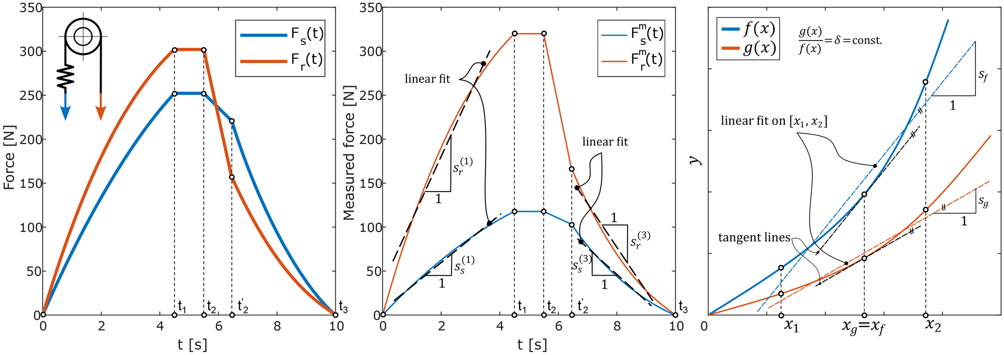 Further, it is proven that with an indirect method, the coefficient of friction (or coefficient of tension loss) can be determined accurately even for a setup that includes nonlinearities such as hysteretic cable behavior or nonlinear testing machine stiffness. The presented method provides a robust procedure that does not need calibrated measurement devices.