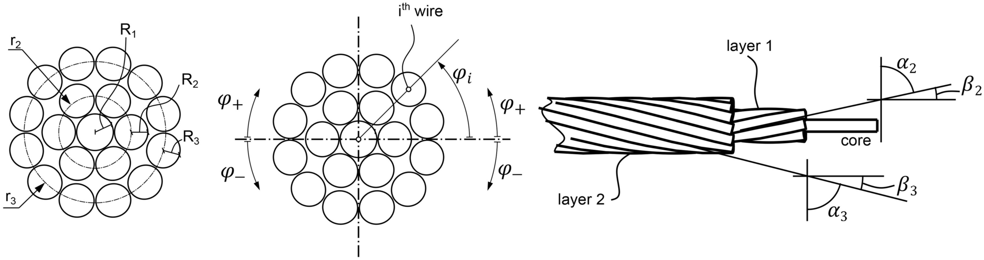 where n is the total number of wires without the core wire. \(\beta _i\) is the lay angle of the individual \(\text {i}^\text {th}\) wire. \(A_i\), \(r_i\), \(R_i\), and \(E_i\) are the individual wire’s cross-section area, the distance of its centerline from the cable centerline, the wire’s radius, and the wire’s modulus of elasticity, respectively. \(\varphi _i\) gives the angular position of an individual outer wire in the cable’s cross-section plane, as presented in Fig. 14. \(\sigma _{T,i}\) is the axial stress in the \(\text {i}^\text {th}\) wire prior to bending, and can be calculated as given by Papailiou [4] in equation (31):
