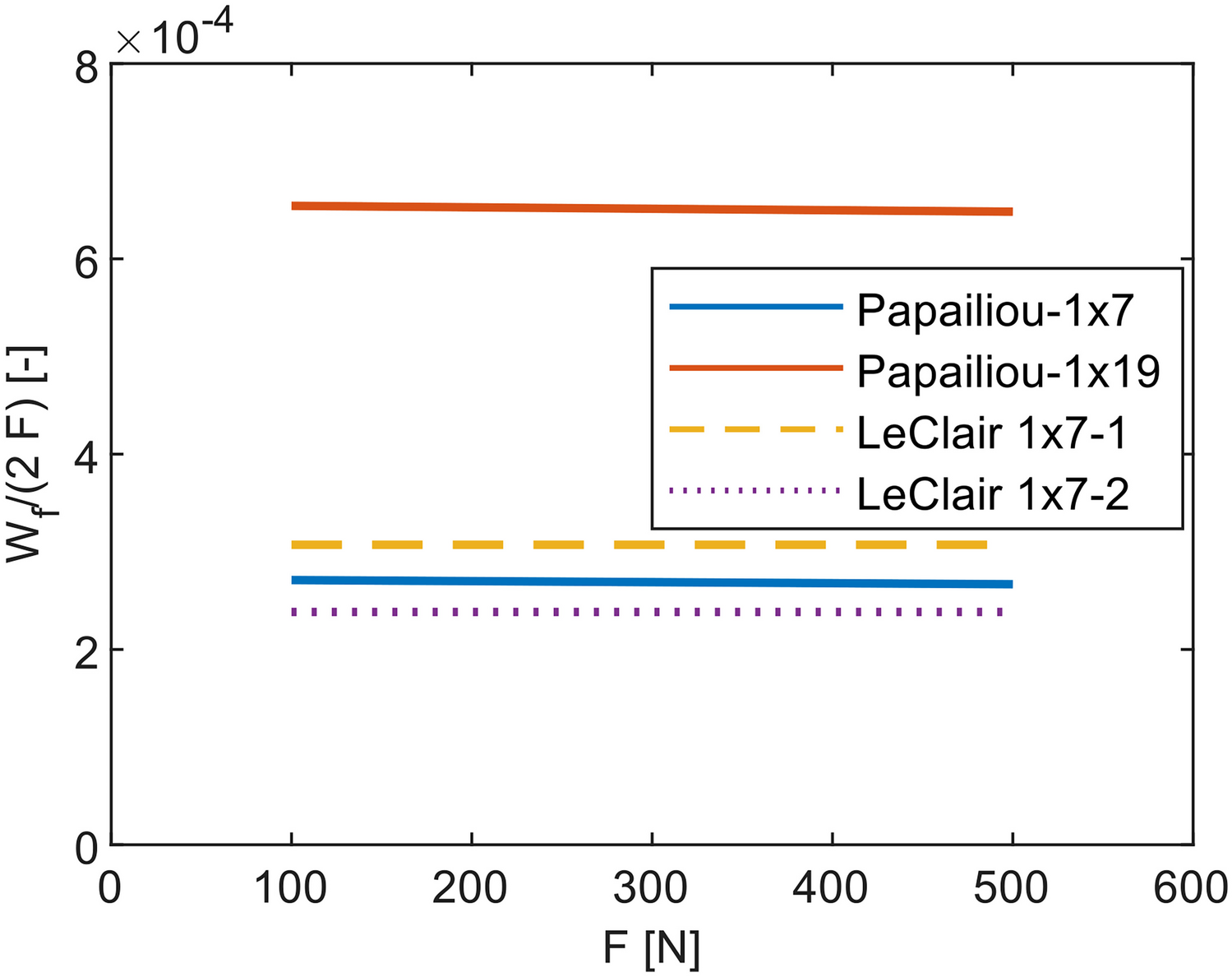 The part of the coefficient of friction that comes from the bending hysteresis is compared in Fig. 16 for the different models applied here. Note that \(W_f\) is divided by the double cable tension to be comparable to the measurements. With the model of LeClair only the 1x7-type can be used. Two results are given in the figure: the first (LeClair 1x7-1) is calculated with the cable strain based on the measured stiffness (given in Fig. 11), while the other (LeClair 1x7-2) is calculated with the strain calculated from the model of the strand [6], with an assumed elastic modulus of 210 GPa. The model of LeClair yield constant results, while Papailiou’s prediction slightly decreases with increasing cable tension.
