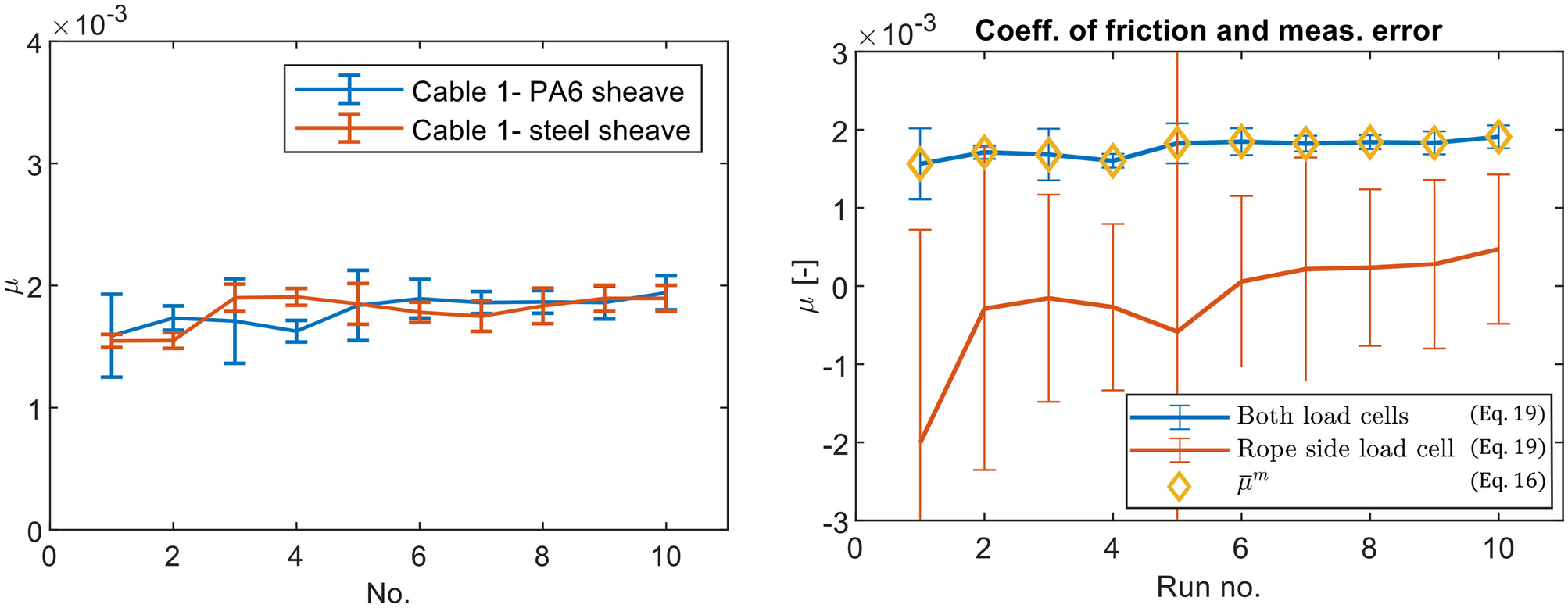The measurement (as presented in "Measurement" section) consists of two parts: the pulley is loaded and unloaded six times in a row, after which the sheave is turned around its axis with a random angle, and the measurement is repeated again. This is done ten times for a setup (for one cable). From one run, six coefficients of friction (cable and bearing combined) can be measured, which yields a mean value and a standard deviation (see the indicated \(\pm 2 \sigma\) range in Figs. 17 and 18). In Fig. 17 (right), the results of a single run are presented for the three different calculation methods: for the best solution, by using equations (17) and (19), for the simplified solution, using only one load-cell data with equation (19), and finally for the calculation of the mean coefficient of friction with equations (15) and (16). Note that the averaging method (\(\overline{\mu }^m\)) does not have an error bar because it completely overlaps with the other results. It is easy to see that the data from one load cell is not enough; it has a huge variance compared to the other two calculation methods. This comes from the different rope stiffnesses in the loading and unloading phases (see 11), which is compensated for in the \(\gamma\) parameter if the force on both sides of the pulley is taken into consideration.
