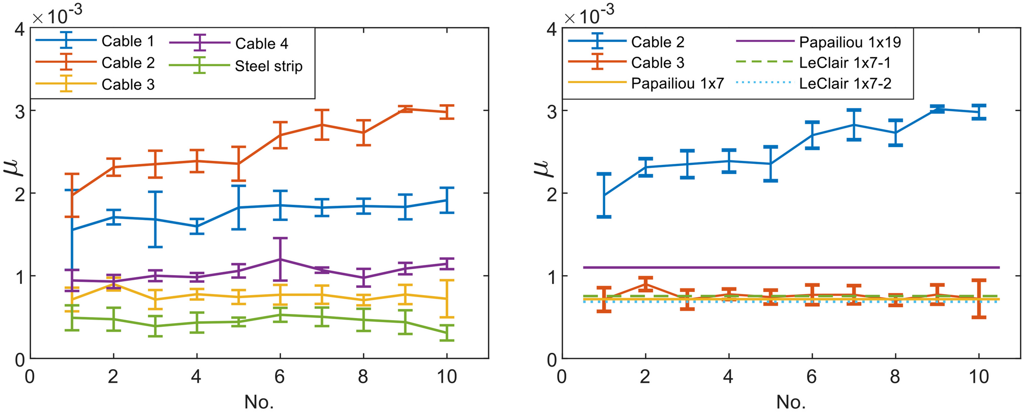 The results in Fig. 17 were obtained with the 7x19-type cable. The results summarized for the four cables and the steel strip are presented in Fig. 18 (left). The measurement made with the steel strip returned a mean value of \(\mu =4.82\cdot 10^{-3}\) which converted to bearing coefficient of friction yields \(\mu _b=\mu \frac{2\,R}{d}=1.5\cdot 10^{-3}\), which corresponds to the upper limit specified by the bearing catalog [17]. As expected, the cyclic bending of the steel strip does not significantly contribute to the tension loss. Since, theoretically, it has no hysteresis, a base measurement made with a steel strip measures the tension loss on the bearings, which can be used to determine the contribution of the cable within a measurement. However, it is important to ensure that no plastic deformation occurs during the process.