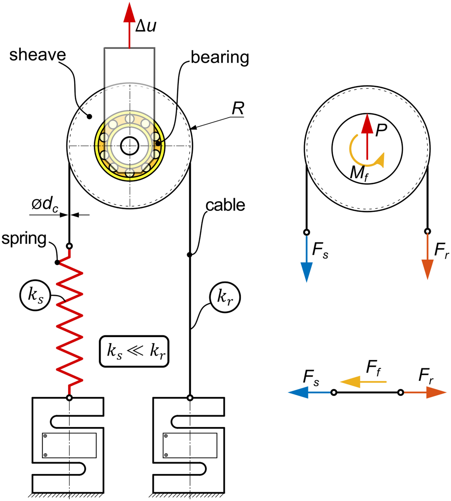 The idea behind this measurement is that the rope on one side of the pulley is considerably stiffer than the spring on the other side (in this case, there were two orders of magnitude between the two stiffnesses). Pulling upwards forces the pulley to rotate in a predefined direction (Fig. 1) due to the different stiffnesses of the rope ends. If the force is measured on both sides (or on one side and on the pulley), the exact frictional force exerted onto the rope by the bearing-pulley unit can be determined. Since the force on the pulley changes proportionally with the displacement \(\Delta u\), one can get many measurement points and check the linear proportionality between the bearing load P and the frictional force \(F_f\) in one measurement.