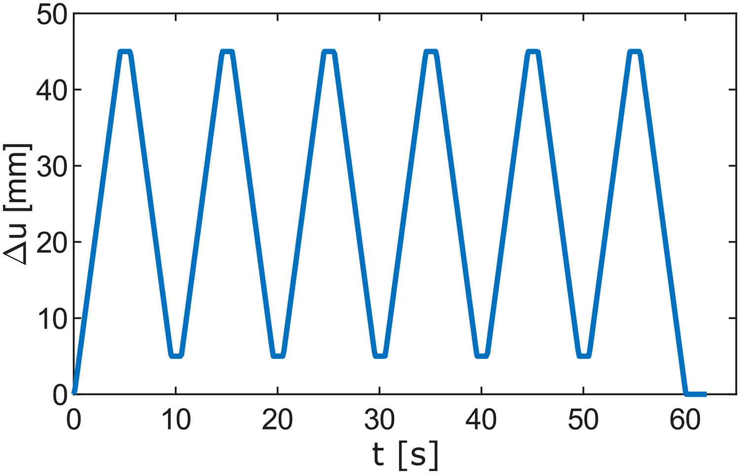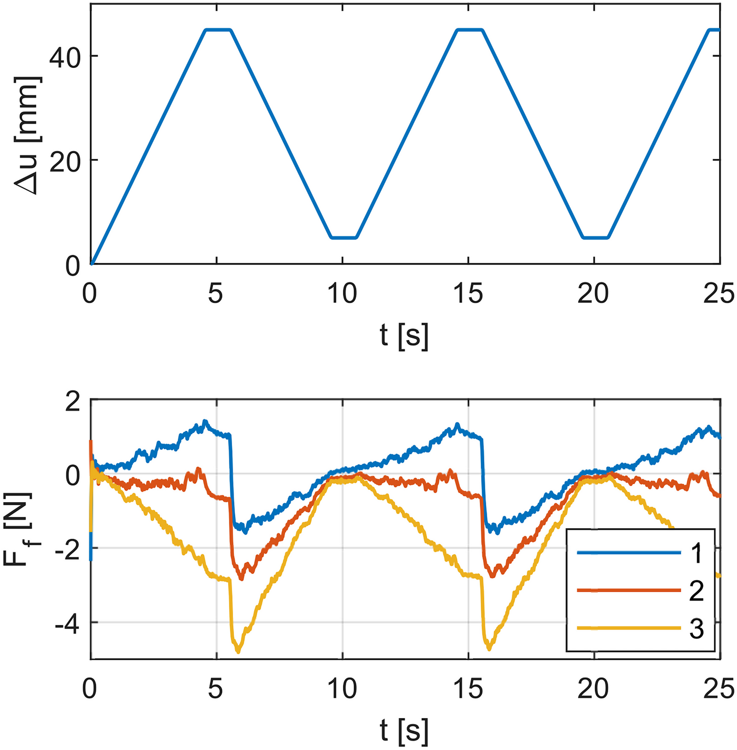 The pulley was moved on a zig-zag path in time, as presented in Fig. 2. This movement produces 6 up-down cycles which can be used as a measurement. The pulley is never lowered totally not to lose tension which would allow any relative movement of the parts. A theoretical time-force diagram is shown in Fig. 3 for an up-down movement of the pulley.