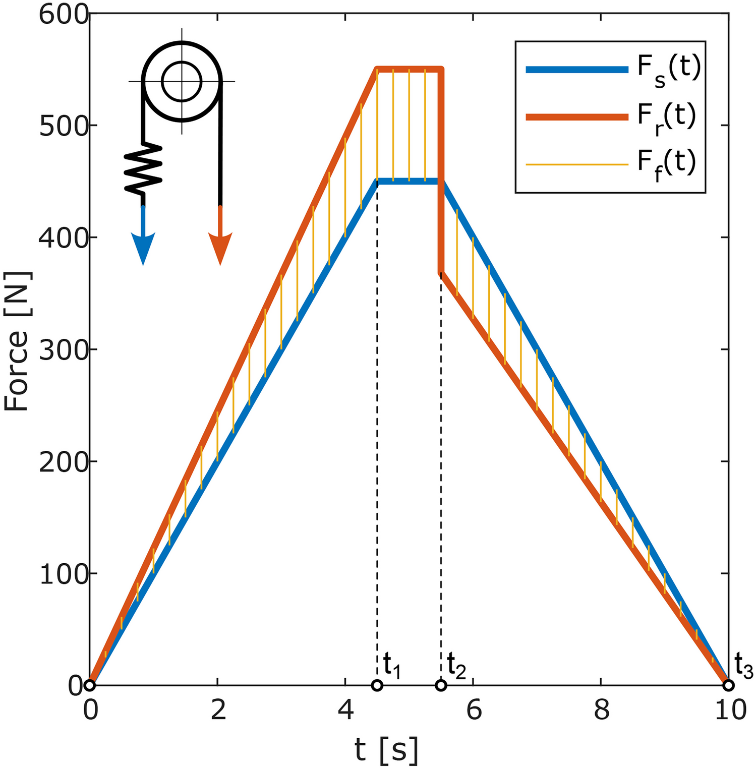 The theoretical function of forces in time, for an arbitrary bearing coefficient of friction \(\mu _b=0.1\) and ideal rope