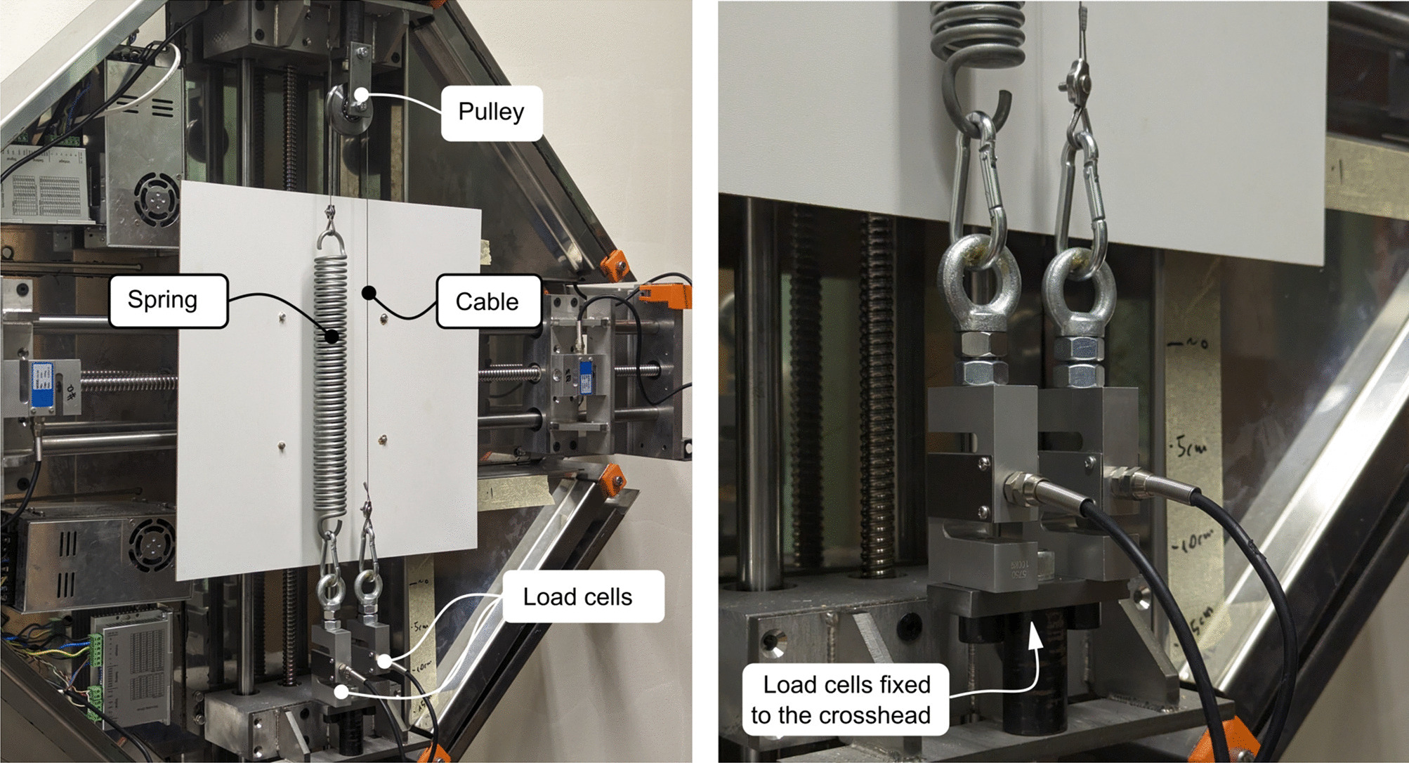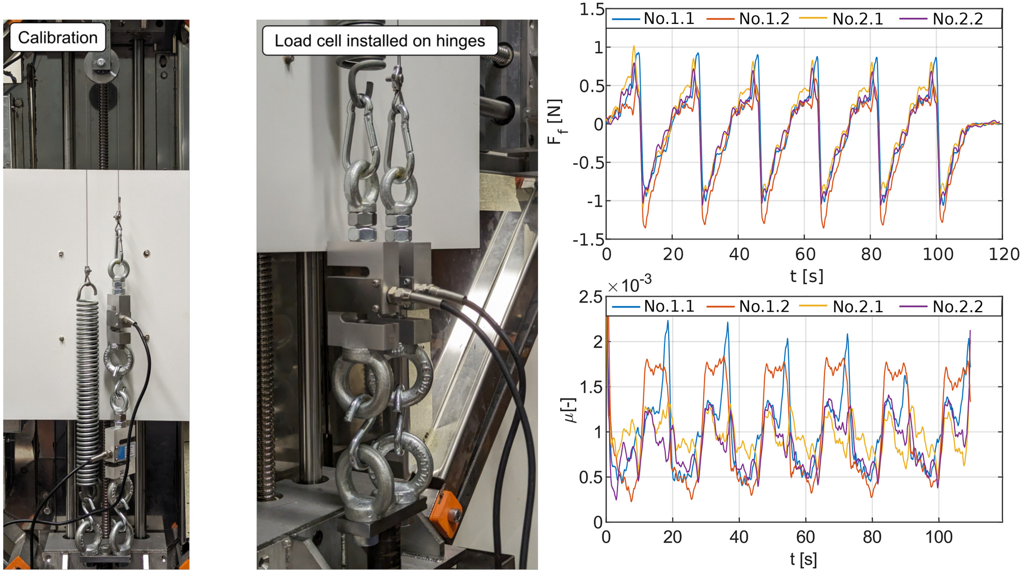 S-beam load cells are sensitive to off-axis loading [18, 19] (usually they are not recommended for applications where high accuracy is required and the mounting of the load cells may change or they are not calibrated in situ); thus, as an initial trial to eliminate the possible issues caused by any bending moments present on the load cell’s body, a hinged installation of the cells was tried with hooks and lifting eyes, as recommended for tension force measurements [18]. The contact surfaces were greased to decrease friction. Theoretically, to obtain the frictional coefficient specified in equation (3), the load cells do not need to be calibrated to an absolute scale; only their response to a given load must be the same. Since the tension loss is expected to be small compared to the bearing load, a calibration process should first be conducted, which ensures the consistency of the measured cable tensions; this is presented on the left side of Fig. 4. This was done as follows: the load cells were connected through hooks and pulled against the spring, after which their calibration constants were tuned so that their output would be the same. In this process, one of the cells was selected as a reference, and the other cell’s calibration constant was adjusted so that its force output as a function of time would have the same slope as the reference cell’s force output.