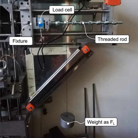 The only goal was to measure the \(\mu\) tension loss factor defined in equation (3), and the attempt to place the load cell under pure tension failed to provide suitable results. As later presented in "Theorethical Model" section, an evaluation method was found, which yields theoretically flawless results for any of the measurements presented above. Considering this, it was rational to keep the load cells fixed to the cross-head because, while the bending of the cell may cause greater errors in the tension loss, the whole setup is easier to handle. With proper evaluation, this measurement error does not impact the final results.