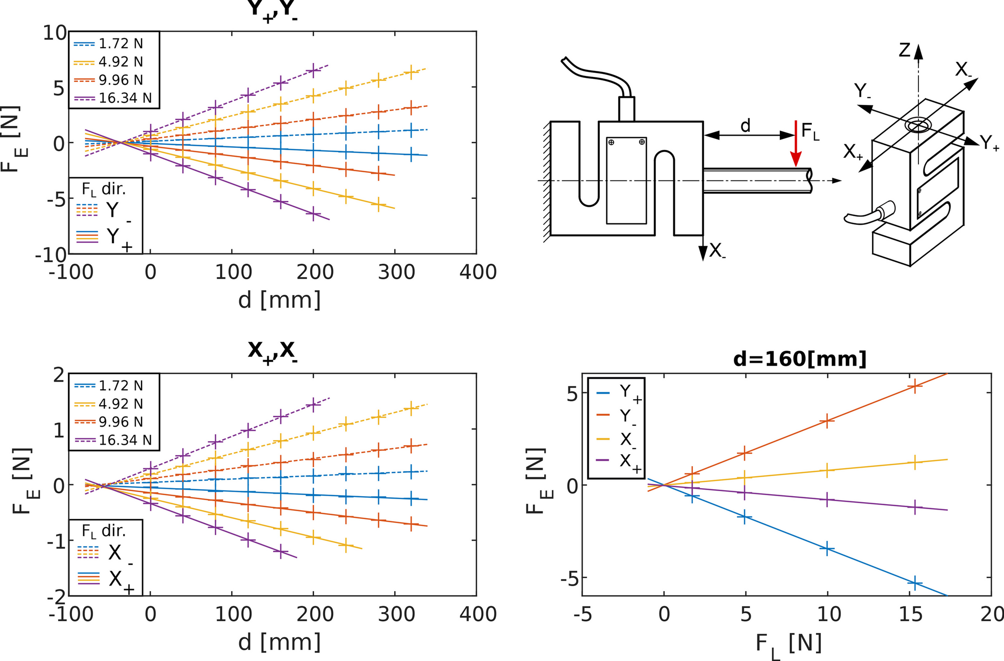 Before deriving methods in "Theoretical Model" section for correctly evaluating the seemingly flawed measurement results, it is necessary to prove that the load cell’s output is practically a linear function of the loading force, even if severe bending effects are present. This was done in two ways: by measuring the cell’s response to different cross-directional loads at different distances and by using finite element method to investigate the behavior of the load cell. The measurement setup can be seen in Fig. 7. The load cell was mounted on the wall so that its main axis (Z in Fig. 8) would be horizontal, and a threaded bar was fixed to its free end. The measurement consisted of hanging several weights (\(F_L\)) on the threaded bar at predefined distances from the cell’s edge while recording the response (\(F_E\)) to the cross-load. The process was repeated for every direction (defined as \(\{X_+,X_-,Y_+,Y_-\}\) in Fig. 8) four times, with four different \(F_L\) load values, which are indicated in the plot legends. The measured data is represented by "+", while the lines result from a linear fit. These show that the measured \(F_E\) value is practically a linear function of both the distance d and the applied cross-load \(F_L\).