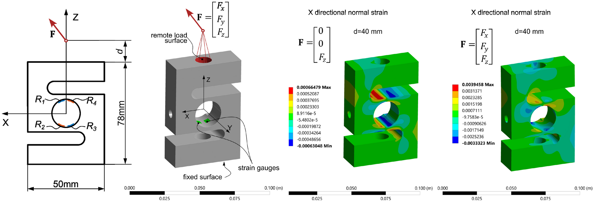 Although the measurements revealed that the load cell would have a linear response for the cross-loads, the superposabiltiy of the cell’s response to different loading directions has to be analyzed in depth. The linearity of the load cell response may be affected by geometrical nonlinearities and the Wheatstone bridge if the load is not purely axial.