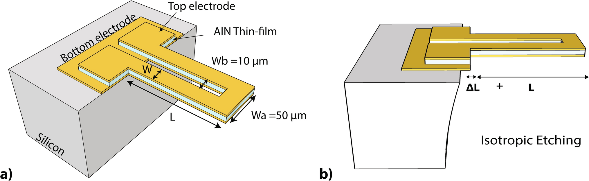 In order to develop a reliable microsystem and offer a standard means of production from an industrialization perspective, the design must take into account the appropriate properties of the materials used to both theoretically predict and simulate their performance before fabrication and subsequent characterization. However, micro-devices are manufactured in different ways. Equation 1 highlights the importance of accurate knowledge of Young’s modulus of the material. Moreover, the undercut (\( \Delta \;L\)) that occurred during sacrificial layer etching (see Fig. 1b) causes an increase in the cantilever length compared to the design, and thus leads to inaccurate natural frequency prediction (Eq. 1). This effective length (\(L_\textrm{eff} = L+ \Delta L\)) and the anchor modification indeed cause a deviation of the resonant frequency. Although the properties of AlN thin films are well known, herein we show that manufacturing imperfections and driving excitation must be carefully considered. As a result, device performance depends on scaling and pre- and post-manufacturing processes.