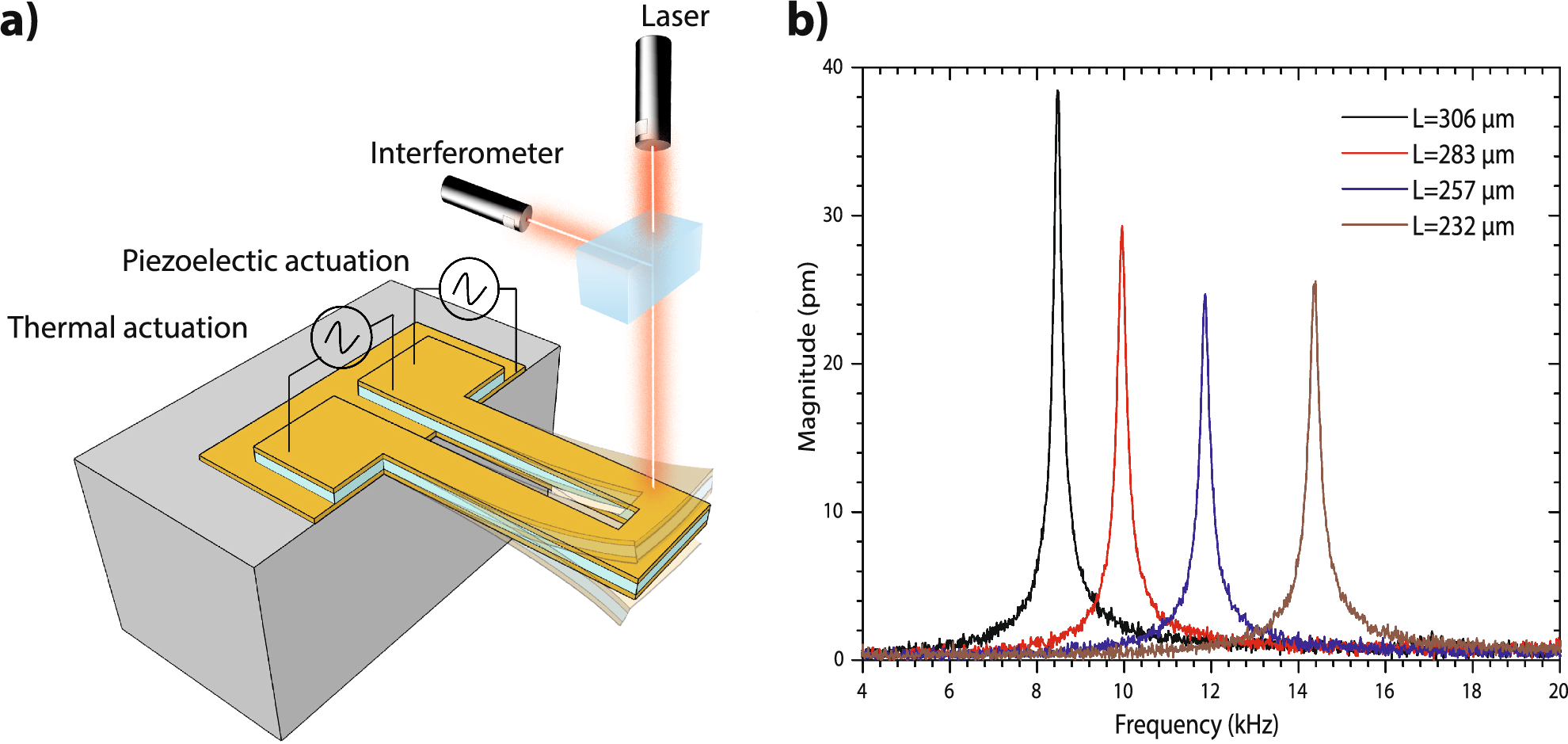 (a) Hybrid thermo-piezoelectric cantilever resonance characterization setup, and (b) laser Doppler vibrometer resonance measurement of the fundamental mode for different HTPC lengths under piezoelectric actuation at 500 mV.