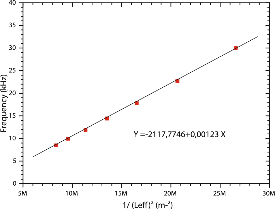 Resonant frequency of cantilever at 500 mV as a function of \(1/L^{2}_\textrm{eff} \). The red line represents the regression, and its equation is given here, where Y is the resonant frequency and X is \(1/L^{2}_\textrm{eff}\).