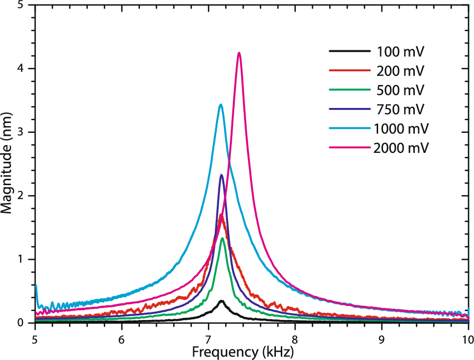 Resonance measurement of the fundamental mode with different magnitude deflection as a function of the applied voltage for 306-μm-long cantilevers.