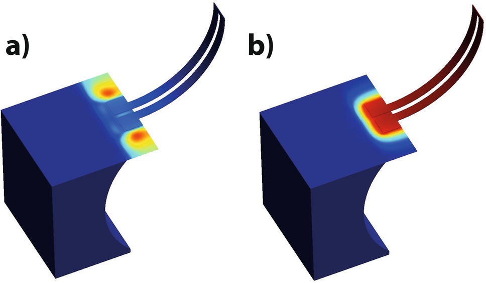 Numerous studies have explored various geometries and excitation mechanisms of cantilevers, including piezoelectric, thermal, and hybrid actuators. Much of this research was motivated by applications in atomic force microscopy (AFM) in the 1990s. However, these early studies focused primarily on fundamental principles and were often limited to specific applications, such as mode splitting due to clamping effects or excitation by Schottky barriers.31,32 Despite these fundamental investigations, the combined effects of thermal and piezoelectric actuation, especially in unconventional geometries such as U-shaped hybrid thermo-piezoelectric cantilevers (HTPCs), remain insufficiently studied.