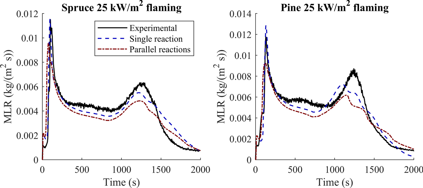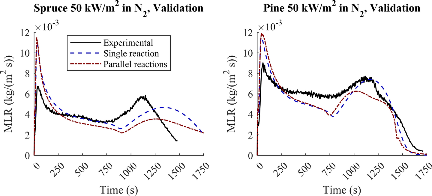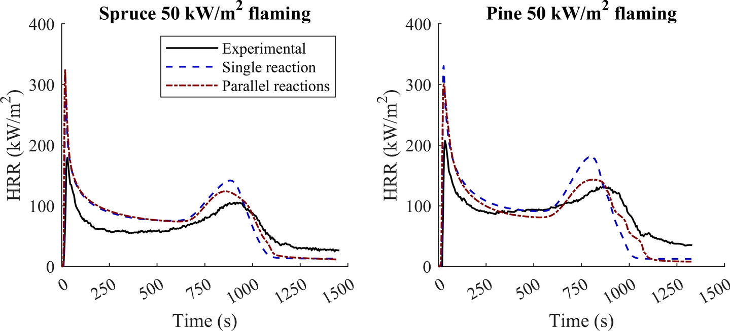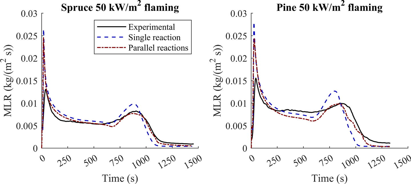 We did not observe significant differences in performance between the single-, and parallel reactions models in the cone calorimeter scale. The work of Rinta-Paavola and Hostikka [32] arrived at the conclusion of the single reaction model being preferable option, for minimizing the model uncertainty while having near-equal performance to the parallel reactions model. The current work supports this conclusion, as not even the more detailed experiments presented in this paper can support the more complex parallel reactions model, at least in the cone calorimeter scale. The parallel reactions model however may find use in calculating the remaining strength of wood under fire, as Adibaskoro et al. [35] found the decline in the wood mechanical strength and its shrinkage by pyrolysis to coincide with hemicellulose and cellulose pyrolysis, respectively.