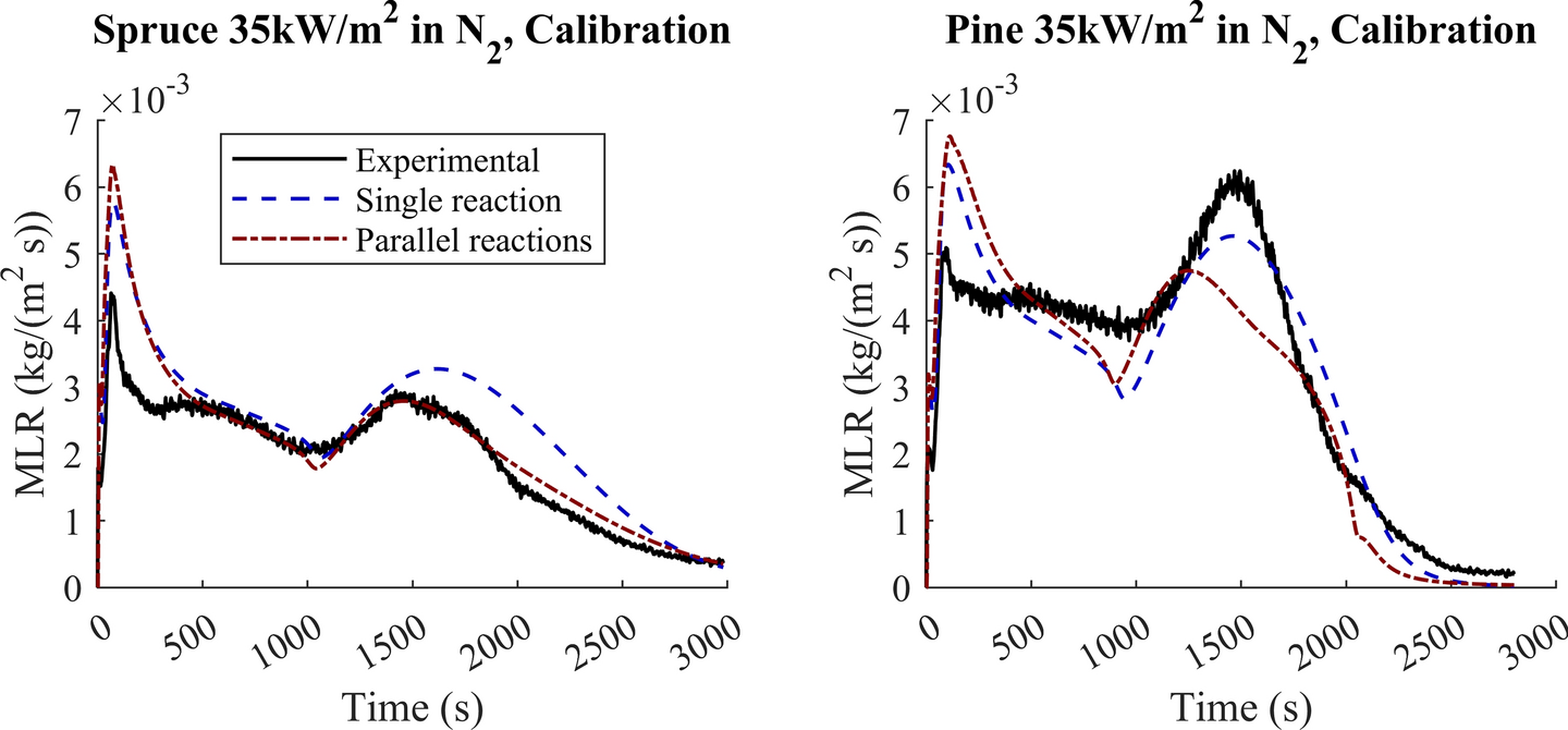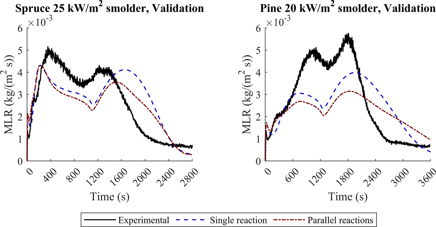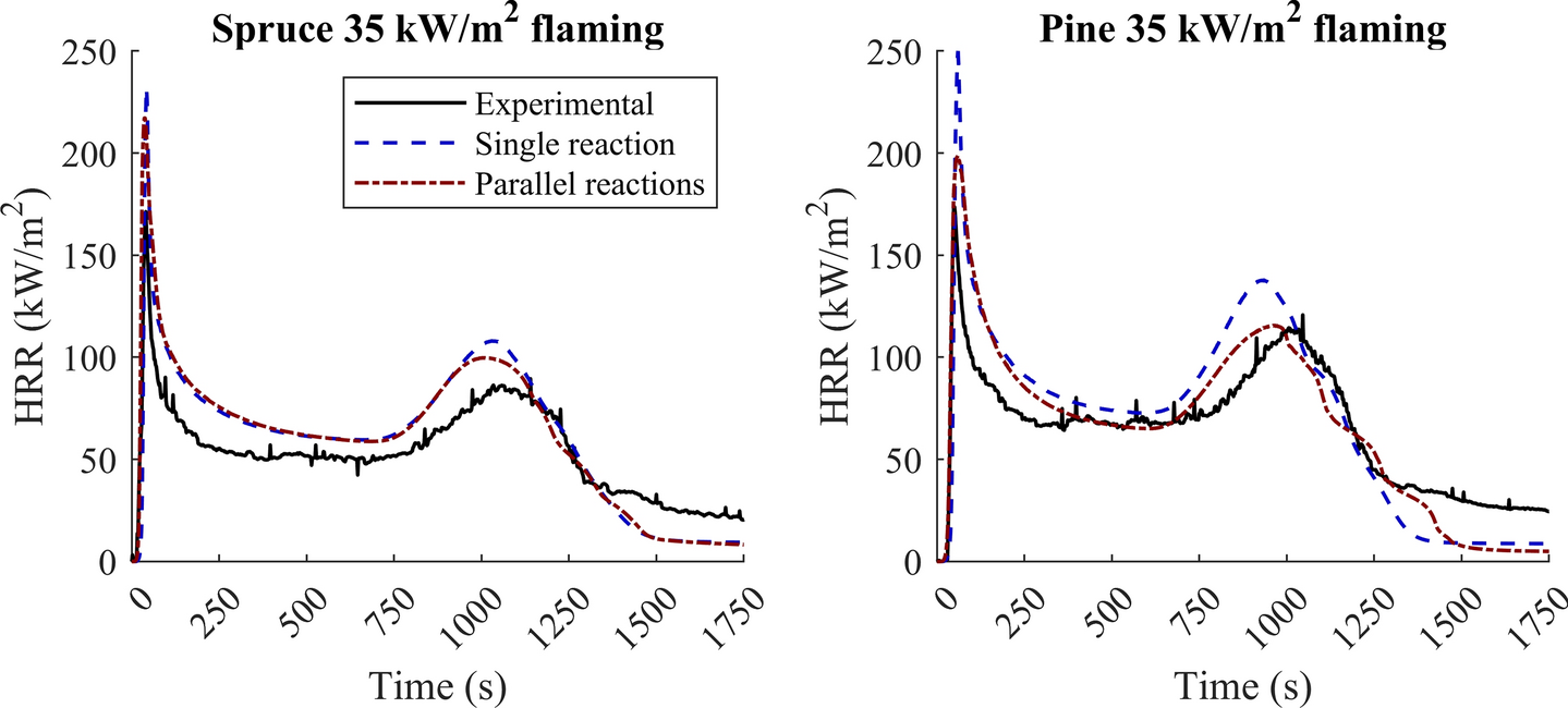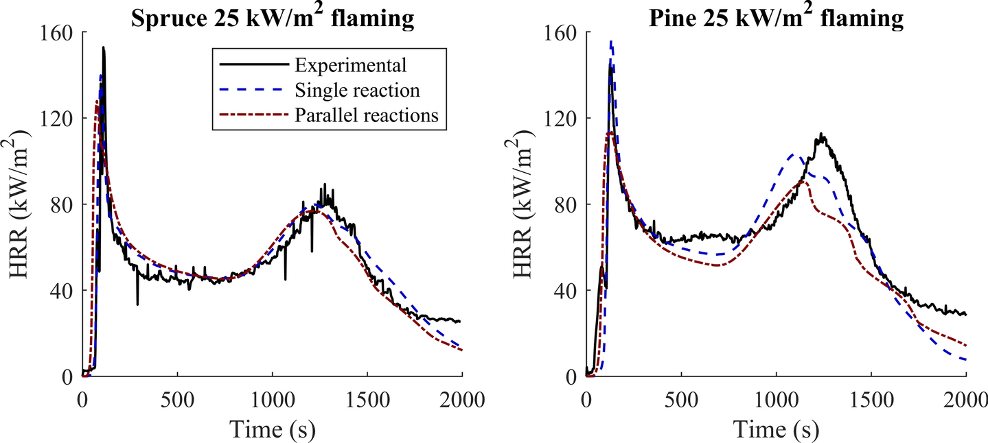 We did not observe significant differences in performance between the single-, and parallel reactions models in the cone calorimeter scale. The work of Rinta-Paavola and Hostikka [32] arrived at the conclusion of the single reaction model being preferable option, for minimizing the model uncertainty while having near-equal performance to the parallel reactions model. The current work supports this conclusion, as not even the more detailed experiments presented in this paper can support the more complex parallel reactions model, at least in the cone calorimeter scale. The parallel reactions model however may find use in calculating the remaining strength of wood under fire, as Adibaskoro et al. [35] found the decline in the wood mechanical strength and its shrinkage by pyrolysis to coincide with hemicellulose and cellulose pyrolysis, respectively.