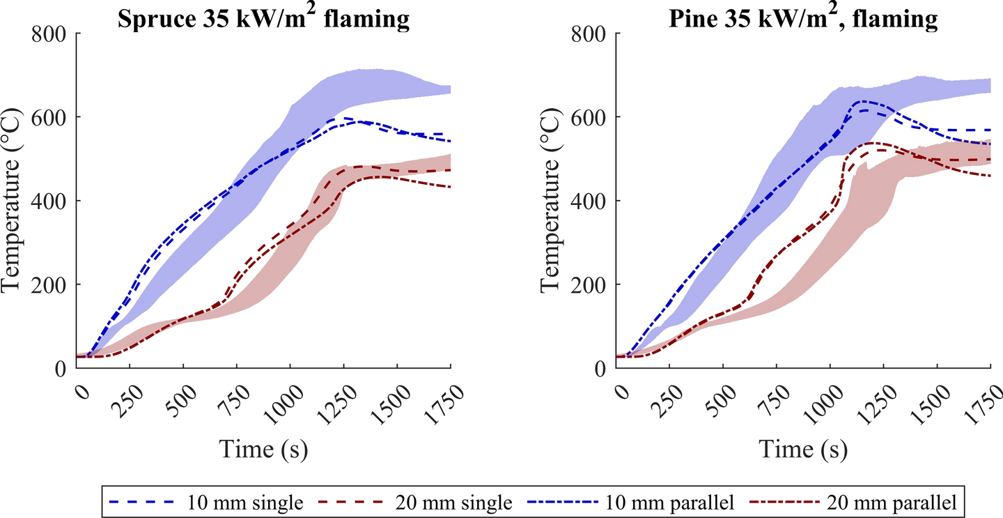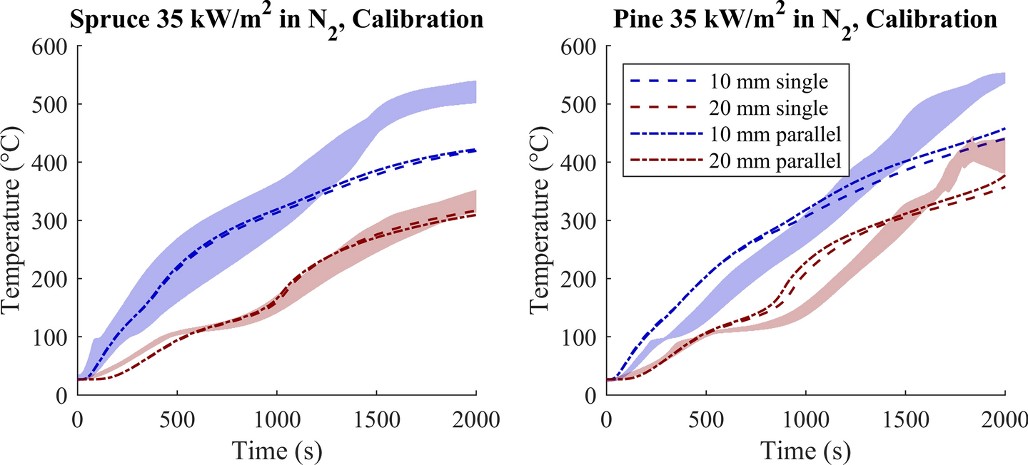 The results in cone calorimeter scale reveals the near-equal quality of fit between the single-, and parallel reactions models for both species of wood across all experimental conditions. Rinta-Paavola and Hostikka [32] concluded, that the parallel reactions model would not offer any advantage over the single-reaction model, but arriving with the added cost of model complexity, and hence uncertainty. However, in that research they used only measurement data that are integral in nature, namely heat release and mass loss, reserving investigating possibility of the parallel reactions model to predict local temperatures and char front progress better as a future research topic. The current results with the internal temperature measurements do not change their previous conclusion: the single reaction model is the preferable option, offering similar performance to the parallel reactions model without its increased model uncertainty.